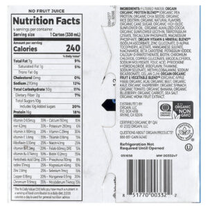 Água filtrada, orgain Organic Protein Blend™ (proteína de ervilha orgânica, sementes de chia orgânica), dextrina de arroz orgânico, sabores naturais orgânicos, açúcar de cana orgânico, óleo de girassol orgânico com alto teor oleico, cacau orgânico alcalinizado, lecitina de girassol orgânico, citrato de tripotássio, tricalcium phosphate, fosfato de magnésio, vitaminas e minerais orgânicos mineral blend™ (ascorbato de sódio, gliconato de zinco, acetato de dextroalfatocoferol, sulfato de manganês, nicotinamida, betacaroteno, iodeto de potássio, pantotenato de cálcio, biotina, cloreto de cromo, gliconato de cobre, o ergocalciferol, molibdato de sódio, ácido fólico, cloridrato de piridoxina, riboflavina, tiamina, selenato de sódio, mecobalamina), bicarbonato de sódio, goma gelana, ou frutas orgânicas orgânicas & vegetal blend™ (fibra de maçã orgânica, açaí orgânico, beterraba orgânica, couve orgânica, framboesa orgânica, espinafre orgânico, tomate orgânico, banana orgânica, mirtilo orgânico, cenoura orgânica), sal marinho, extrato de luo han guo orgânico.