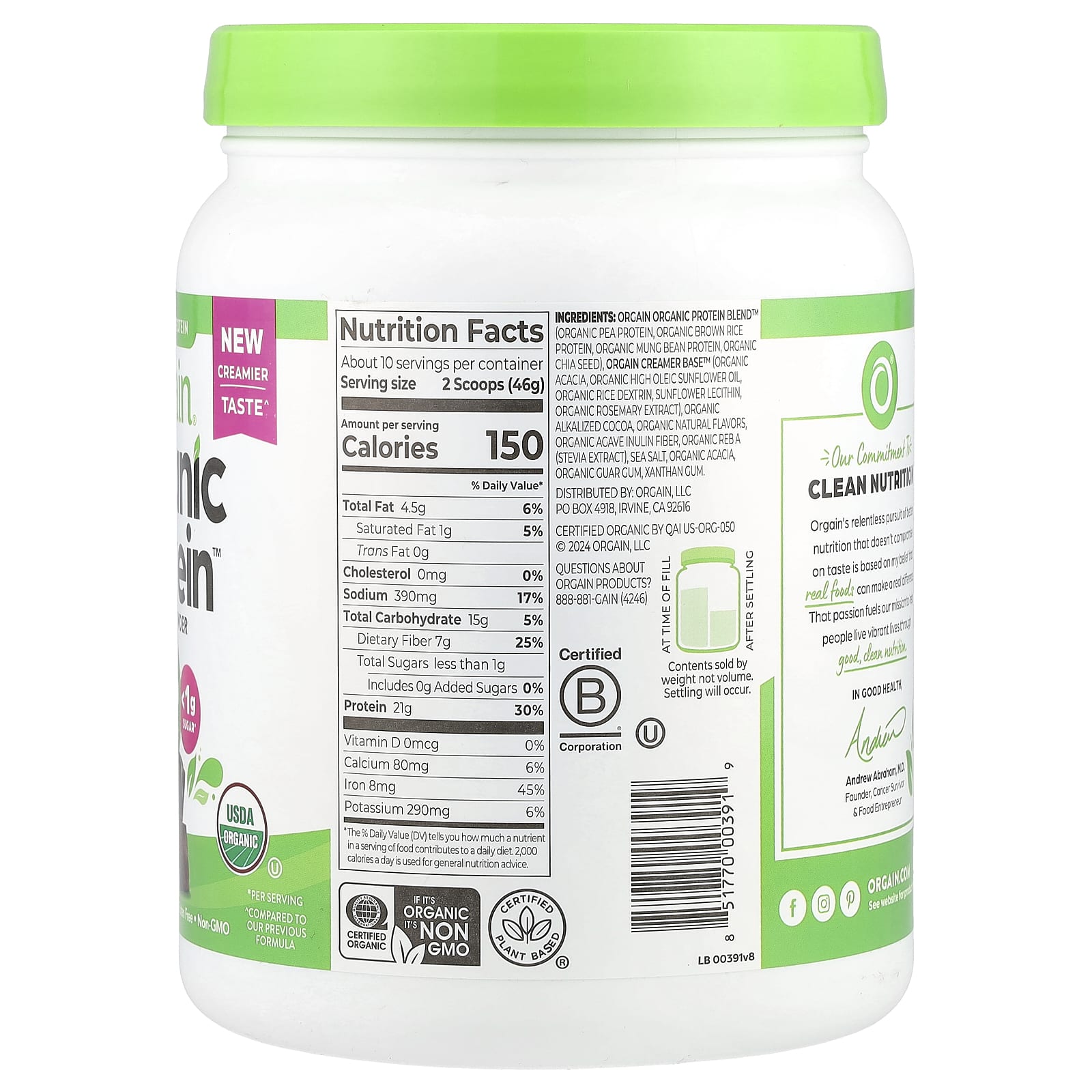 Orgain Organic Protein™ em Pó Fudge Cremoso de Chocolate 462 g (102 lb) – Orgain Nutrição Esportiva Proteína Proteína Vegetal Mistura Proteica à Base de Plantas.