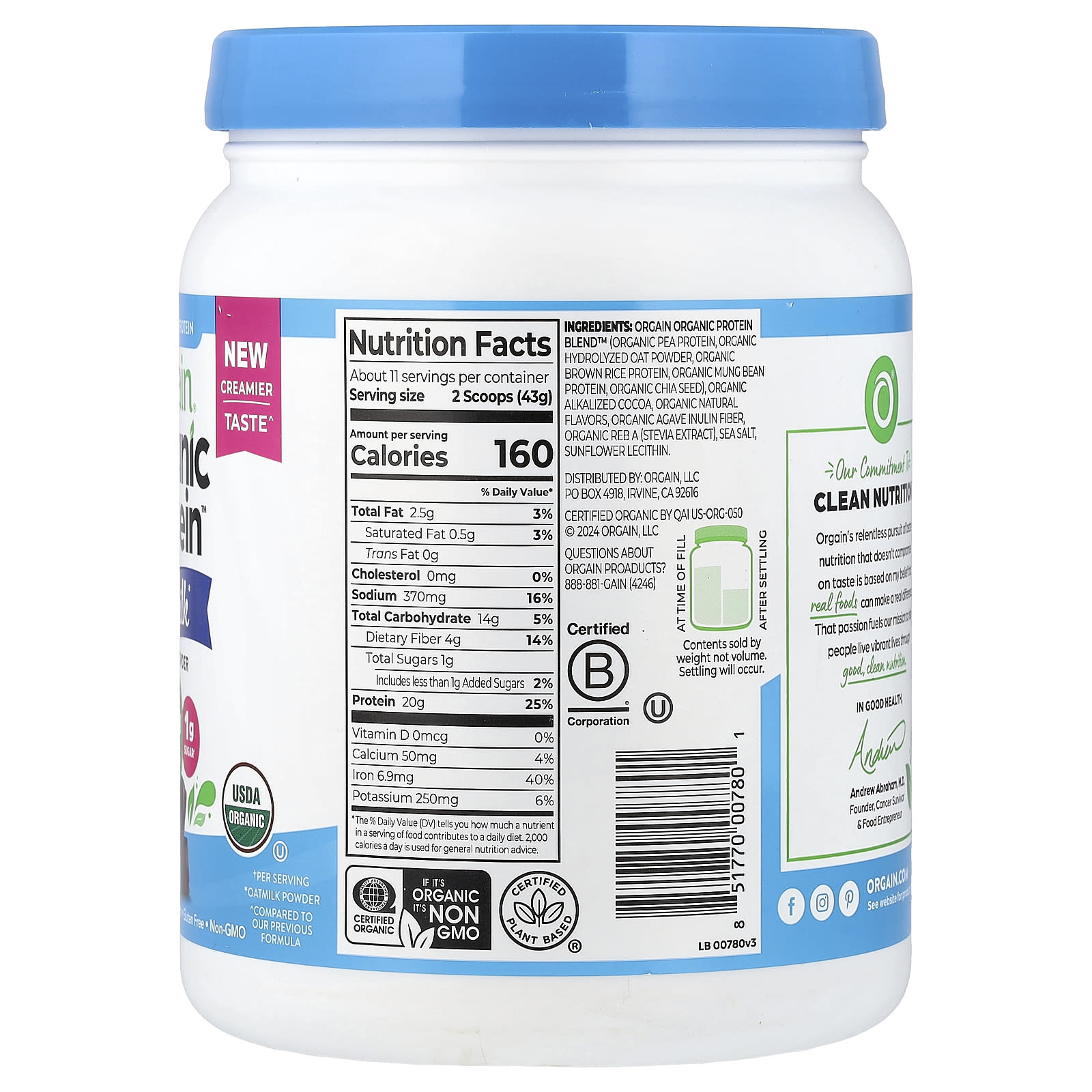 Orgain Organic Protein™ em Pó + Leite de Aveia À Base de Plantas Chocolate 479 g (105 lb) – Orgain Nutrição Esportiva Proteína Proteína Vegetal Mistura Proteica à Base de Plantas.