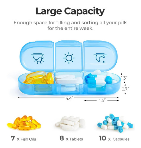Grande capacidade: este elegante organizador de medicamentos 3 vezes ao dia tem uma capacidade aprimorada de encher e pedir todos os seus comprimidos da manhã, do meio-dia e da noite por uma semana. Cada compartimento pode conter até 7 óleos de peixe ou 10 cápsulas, o que é um auxiliar de saúde ideal para uso. (Tamanho total: 6,69 x 5,51 x 1,57, Tamanho diário do recipiente da pílula: 4,4×1,3×0,7.)
