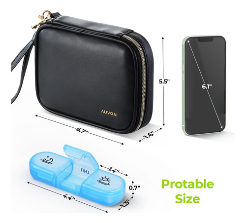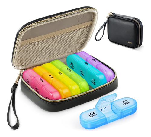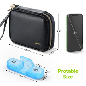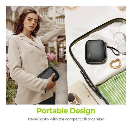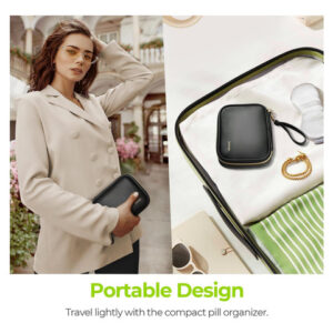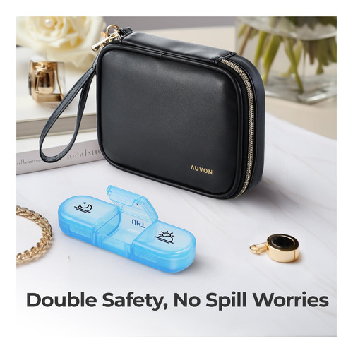 Organizador de comprimidos elegante: esta caixa de comprimidos semanal vem com uma elegante bolsa de couro PU preta que possui um zíper dourado durável, não desbota, não tem cheiro peculiar e é durável. Ajuda sua pílula a evitar derramamentos e também pode proteger sua privacidade.