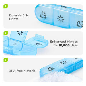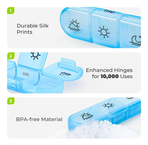 Qualidade confiável: o organizador de vitaminas sem BPA com revestimento reforçado, dobradiças internas e estampas de seda pode ser usado 20.000 vezes.