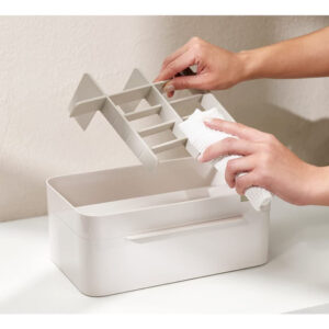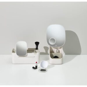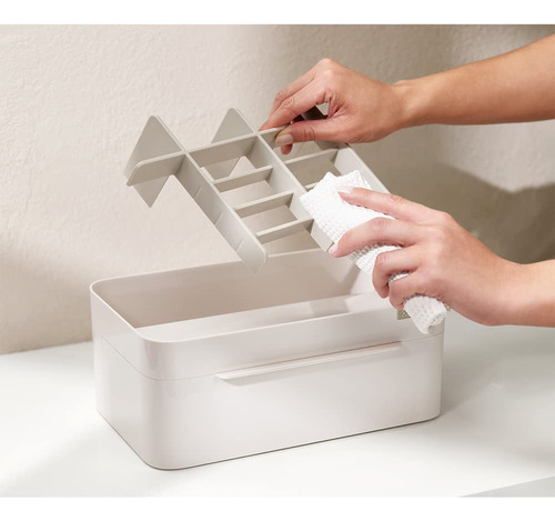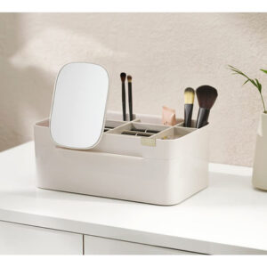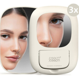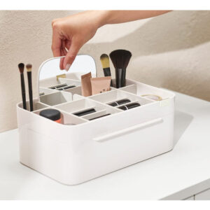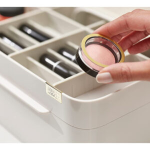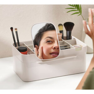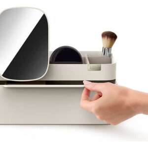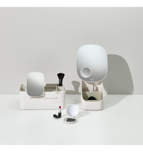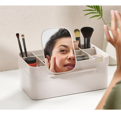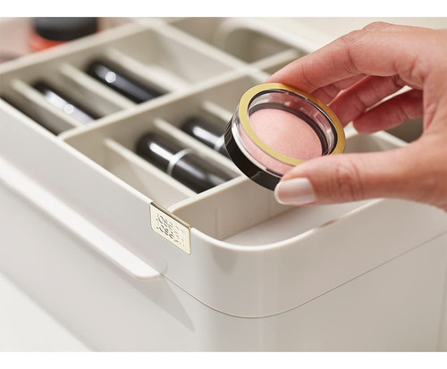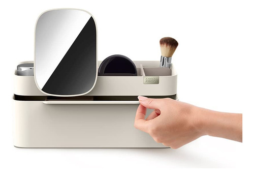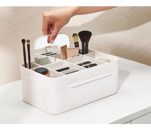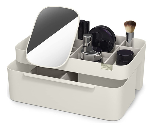Organizador de armazenamento de cosméticos Joseph Joseph 75005 Viva Makeup com gaveta, grande com espelho, concha e creme — Compartimentos profundos para pincéis, máscaras e lápis delineadores de olhos — Compartimentos rasos para itens pequenos, como protetores labiais, blushers e sombras — Gaveta com fecho magnético para almofadas de algodão, cotonetes e esponjas de maquiagem — Espelho de aumento removível 2 em 1 — Desmonta para facilitar a limpeza