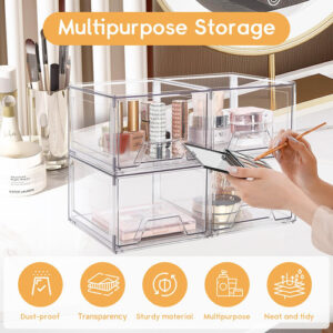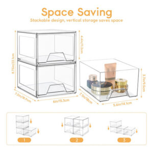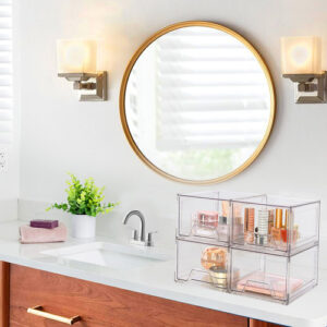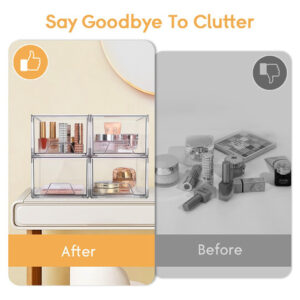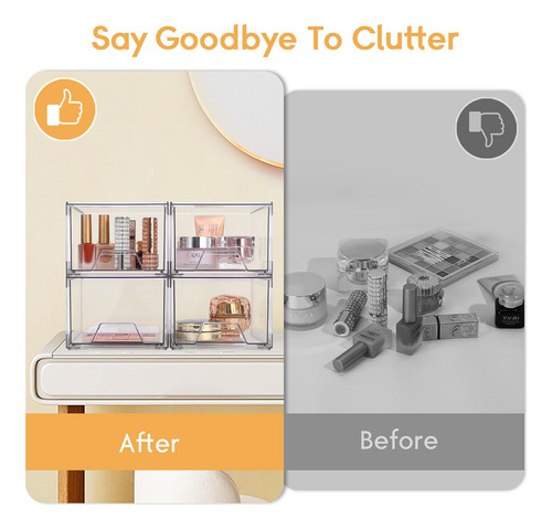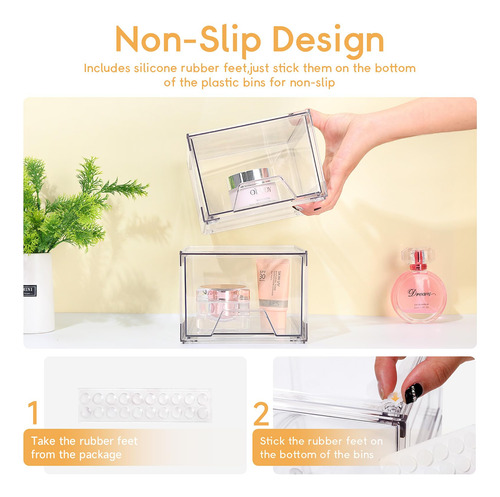 Nossas gavetas de armazenamento ajudam você a se organizar em todos os lugares da sua casa. Eles podem ser usados como organizadores e armazenamento para maquiagem, bancada de banheiro, cozinha ou lavanderia embaixo da pia, armário de remédios, despensa, penteadeira. Você pode usar com flexibilidade nosso organizador de armazenamento para organização e armazenamento da casa de acordo com suas necessidades. – Material de alta qualidade Este organizador de maquiagem é feito de plástico transparente premium sem BPA. Os organizadores e o armazenamento do banheiro são robustos, inquebráveis, resistentes a arranhões e transparentes, permitindo que você encontre rapidamente os itens de que precisa, mantendo as coisas arrumadas e sem poeira. As gavetas de armazenamento empilháveis são mais fortes e seguras do que o vidro, o que as torna um material de armazenamento ideal. – Economizam espaço Essas gavetas organizadoras de maquiagem transparentes ajudam você a organizar todos os cantos da sua casa, mantendo pequenos itens no organizador de gavetas de acrílico para deixar o espaço da bancada mais organizado. O design empilhável dessas gavetas de armazenamento de acrílico permite o armazenamento vertical, economizando uma quantidade significativa de espaço. – Organizadores e armazenamento versáteis O design empilhável torna essas gavetas de maquiagem adequadas para uso como caixas de armazenamento e armários em banheiros, cozinhas, armários, armários, mesas e escritórios. Essas gavetas de armazenamento de bancada podem conter vários itens, como ferramentas de maquiagem, produtos para a pele, joias, grampos de cabelo, artigos de papelaria, medicamentos, lanches, itens diversos, etc. – Design de alça puxável As gavetas empilháveis de armazenamento de maquiagem apresentam um design de alça removível com uma alça fácil de segurar, permitindo que deslizem para dentro e para fora com muita facilidade. O organizador de gavetas de armazenamento vem com almofadas de silicone adicionais que podem ser coladas na parte inferior da caixa externa para fins antiderrapantes, garantindo que a moldura não se mova ao retirar a gaveta. – Serviço 100% de satisfação do cliente. Essas gavetas de acrílico são fáceis de limpar; basta limpá-las suavemente com um pano úmido ou lavá-las com água neutra e sabão. Não os coloque na máquina de lavar louça para limpeza! Se você tiver alguma dúvida sobre o organizador de gavetas de maquiagem, não hesite em nos contatar, e nós lhe forneceremos um serviço pós-venda satisfatório.