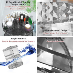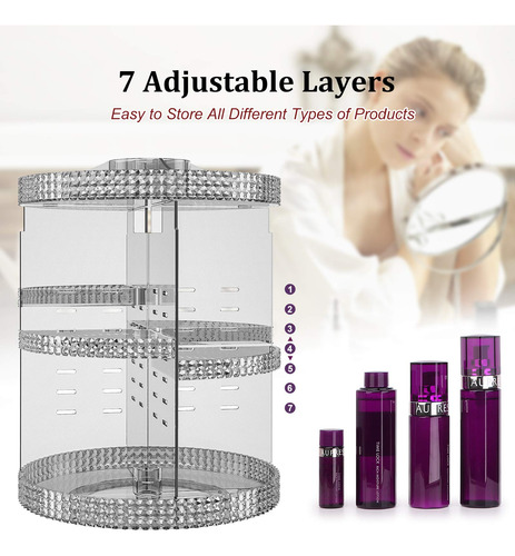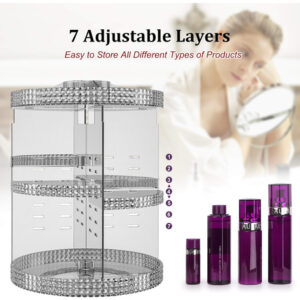 Mantenha seus produtos de beleza organizados e facilmente acessíveis, enquanto maximiza o espaço com o organizador de maquiagem rotativo Awenia 360. Grande capacidade: com o compartimento superior e 7 camadas ajustáveis e porta-brincos/colar, nosso organizador de maquiagem giratório de 360° pode acomodar facilmente pelo menos 63 unidades de cosméticos; experimente com 18 peças de perfume e 14 unidades de tônico facial e 12 unidades de hidratante facial e 5 unidades de removedor de maquiagem e 6 unidades de pincéis de maquiagem. Material e construção resistentes: Feito de acrílico de alto impacto para melhor durabilidade, mais resistente e durável do que o material ABS, pode suportar mercadorias pesadas de até 10 kg. Anéis de borracha premium são adicionados para melhorar a firmeza de toda a estrutura. Fácil acesso à sua maquiagem com rotação de 360 graus: o organizador de tela cosmética de acrílico transparente mantém tudo visível e permite que você encontre rapidamente o que precisa e tenha acesso a ele girando o organizador; a base estável gira de forma suave e silenciosa. Camadas ajustáveis e fácil instalação: Aqui estão 7 camadas ajustáveis para escolher, você pode ajustar a altura da bandeja de acordo com a altura de seus produtos. Você pode instalá-lo facilmente em 5 minutos, presente perfeito para sua família ou amigos. Design antiderrapante e armazenamento de acessórios: adicionamos peças antiderrapantes na parte inferior e abas de segurança elevadas na placa superior para evitar quedas; o design em diamante e os slots de divisória sobressalentes não são apenas decorativos, mas também práticos para guardar brincos e outros acessórios. Pacote: 1 x bolsa de viagem 1 x placa base 1 x placa superior 2 x ripa 4 x bandeja 20 x anel de borracha (4 anéis extras são adicionados) 1 x manual do usuário Nota: os cosméticos exibidos nas fotos não estão incluídos. – Rotação de 360 graus sem ruído e 7 camadas ajustáveis: a base estável reforçada gira suave e silenciosamente, fácil acesso a toda a sua maquiagem em segundos. 7 camadas ajustáveis podem ser ajustadas para acomodar todos os seus cosméticos em tamanhos diferentes e altura. – Capacidade extra grande: a unidade de armazenamento de cosméticos Awenia pode conter pelo menos 63 unidades de produtos para a pele juntos: 18 unidades de perfume e 14 2 peças de tônico facial e 12 unidades de hidratante facial e 5 unidades de removedor de maquiagem e 6 peças de pó prensado e 8 pincéis de maquiagem, economize 60% de espaço para você. Tamanho total: 11 x 11 x 15 polegadas. – Robusto e durável: o organizador de maquiagem Awenia é feito de material acrílico de alta qualidade, o que torna nosso armazenamento de maquiagem claramente transparente e mais durável do que outros organizadores de plástico. 20 anéis de borracha premium (4 anéis extras são adicionados) e fundo antiderrapante ajudarão a melhorar a firmeza. – Design elegante e prático: nossa placa superior com design de diamante pode não apenas conter vários produtos de beleza, mas também ganhar a vida lugar elegante e arrumado. O fundo antiderrapante e as abas de segurança levantadas podem manter todos os seus itens no lugar. – Fácil de instalar e lavável: simples de montar e desmontar de acordo com nosso manual do usuário; com design desmontável e material lavável, o armazenamento de maquiagem em acrílico não mudará de forma e de cor clara após ser lavado várias vezes. Todos os clientes pedidos na Awenia desfrutarão de 30 dias de devolução total do dinheiro, 180 dias de substituição e serviço de suporte vitalício. Se você tiver algum problema, informe-nos imediatamente, nossa equipe de atendimento oferecerá uma boa solução em 12 horas.