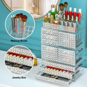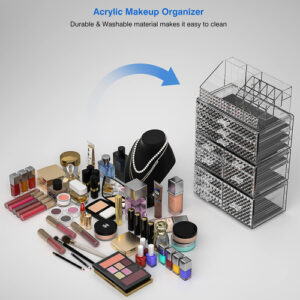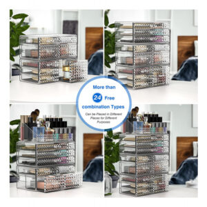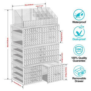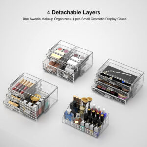 Organizador de maquiagem – 4 organizadores de maquiagem empilháveis e 11 gavetas removíveis — Os recipientes de armazenamento Awenia são empilháveis, o armazenamento vertical economiza muito espaço. Você também pode usá-los lado a lado ou usar separadamente. Coloque seus pequenos objetos em cima do organizador de acrílico para deixar o espaço da bancada mais arrumado. 11 gavetas removíveis com tamanhos diferentes para classificar pincéis de maquiagem, paletas de sombras, frascos para a pele e compactos. – Grande capacidade e mantenha sua casa/escritório organizada — Mantenha os itens contidos, organizados e livres de poeira e crie um espaço limpo de seus banheiros, lavanderia, quartos, escritórios, garagens, salas de brinquedos, salas de artesanato e salas de jogos, geladeira, armários ou prateleiras de despensa. Um ajudante de armazenamento ideal em apartamentos, condomínios e dormitórios. Tamanho do organizador de gavetas: 15,8 polegadas* 9,6 pol.* 5,9 polegadas. – Organizador multiuso — As gavetas de armazenamento Awenia ajudam você a organizar todos os lugares de sua casa e escritório, organizadores e armazenamento para maquiagem, bancada de banheiro, cozinha ou lavanderia embaixo da pia, armário de remédios, despensa, penteadeira; também são perfeitos para guardar material de escritório, como canetas, post-its, cola, fita adesiva, tesoura, grampeador, clipes de papel, telefone celular, cartões de visita, etc. – Durável e fácil de limpar — O design quadrado transparente espesso aumenta a estabilidade e Durabilidade. O armazenamento lavável de maquiagem em acrílico não muda de forma e cor clara após ser lavado várias vezes. Os produtos de beleza Awenia com design de diamante tornarão sua penteadeira elegante e linda. – Garantia vitalícia e melhor presente — Todos os clientes pedidos na Awenia desfrutarão de 30 dias de devolução total do dinheiro, 180 dias de substituição e serviço de suporte vitalício. Se você tiver algum problema, informe-nos imediatamente, nossa equipe de atendimento oferecerá uma boa solução em 12 horas. Melhor presente no Dia das Mães, Ação de Graças, Natal, Dia dos Namorados, Ano Novo, aniversários e qualquer outro feriado.