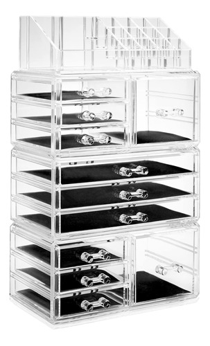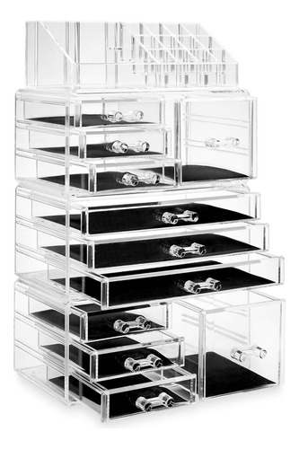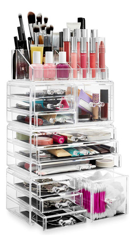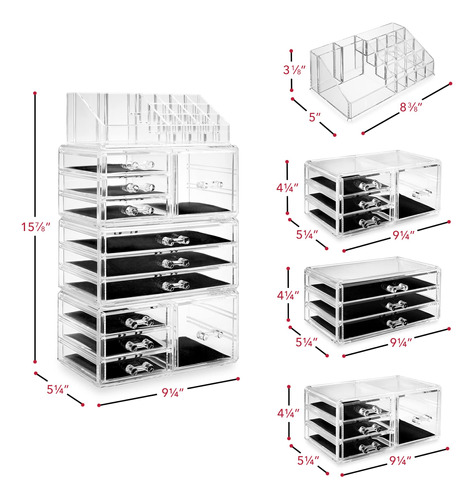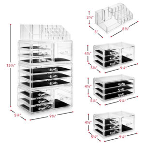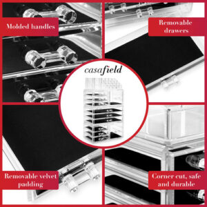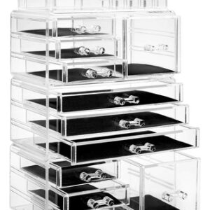 Organizador de maquiagem cosmética acrílico Casafield e vitrine para armazenamento de joias — Conjunto grande de 16 compartimentos, 2 caixas e 9 gavetas — Transparente — organizador de cosméticos e joias de 4 peças: organize lindamente seu batom, brilho, sombras, blush, base, rímel e muito mais com este organizador de maquiagem de quatro peças da Casafield. A seção superior possui 12 compartimentos para batom e 4 compartimentos abertos de vários tamanhos. A segunda e a quarta seções incluem 3 gavetas curtas e 1 cubo, enquanto a terceira seção inclui 3 gavetas longas. – Design durável e de qualidade premium: feito de acrílico premium e durável com alças moldadas por especialistas. As gavetas totalmente removíveis com forros protetores oferecem amplo espaço de armazenamento enquanto protegem suas joias e maquiagem. – Organização elegante e elegante: projetada para combinar qualquer decoração com a praticidade em mente. Este organizador transparente e cristalino é a solução perfeita para organizar todos os seus cosméticos e joias convenientemente em um só lugar. É o presente perfeito para qualquer fashionista. – Versátil, economiza espaço: nosso organizador de maquiagem e joias é multifuncional. Cada seção é empilhável e interligada; elas podem ser usadas como uma peça ou usar cada seção individualmente, dependendo do seu espaço e necessidade. – Uso multiuso: embora seja ideal para a organização de joias e maquiagem de sua cômoda ou penteadeira, este conjunto removível, interligado e empilhável também é ótimo para o escritório ou em qualquer outro lugar que precise ser organizado com uma solução de armazenamento atraente.
