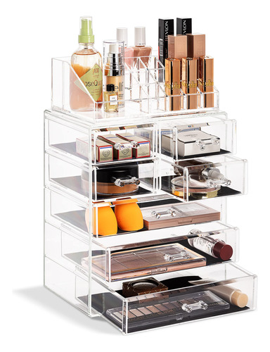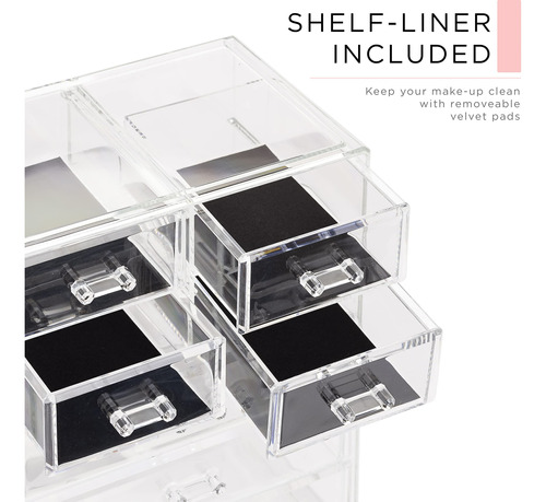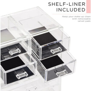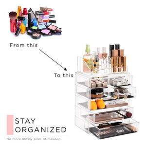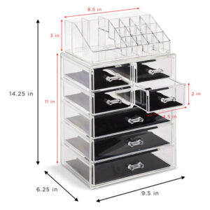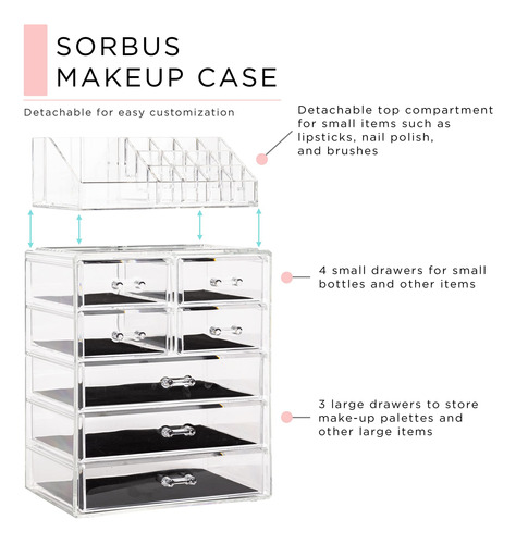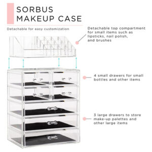 Organizador de maquiagem cosmética Sorbus Clear — Armazenamento, estojo e expositor de maquiagem e joias — Design espaçoso — Ótimo suporte para cômoda, banheiro, penteadeira e bancada (3 gavetas grandes e 4 pequenas) — Organizadores e armazenamento de maquiagem — Organize todos os seus produtos de beleza, cosméticos e acessórios em um organizador de maquiagem fácil de usar para penteadeira. Desfrute de um deslumbrante organizador personalizado de armazenamento de maquiagem e cosméticos (sem necessidade de montagem). – Elegante e estiloso – Exterior chique e elegante – Seu estilo claro cria fácil visibilidade e uma tela atraente que combina perfeitamente com a maioria das decorações – O estojo de maquiagem é um ótimo presente para qualquer garota, adolescente, adulta, amante de beleza, moda e maquiagem. – Exiba e guarde lindamente – O organizador de armazenamento de maquiagem combina com batom, rímel, base, bronzeador e blush., sombra, esmalte, primer, pós e até mesmo um pequeno espelho – Também pode ser usado para guardar joias, roupas pessoais acessórios, ferramentas de higiene pessoal, lembranças e muito mais – Cabe na maioria das cômodas, mesas de banheiro e bancadas. – FUNCIONAL E CONVENIENTE – Mantenha a maquiagem e os acessórios limpos e organizados para facilitar o acesso – Reduza a bagunça, economize tempo na preparação e economize espaço – Compartimentos removíveis convenientes no nível superior mantêm os itens protegidos, na vertical, visíveis e no lugar, para maior comodidade. – DURÁVEIS E LONGOS DURÁVEL — Feito de plástico transparente durável semelhante ao acrílico — Inclui 3 gavetas grandes, 4 gavetas pequenas e 16 compartimentos com compartimentos — As gavetas se abrem suavemente com alças fáceis de segurar – Também pode ser usado para complementar outros organizadores da Sorbus – Mede aproximadamente 9,25 L x 6,25 L x 14,25 A (gavetas com 1,87 de profundidade)