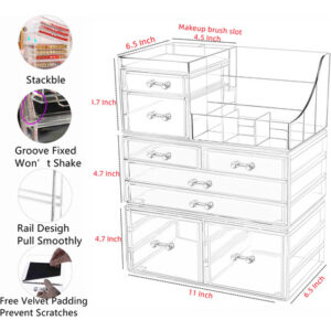 Organizador de maquiagem de acrílico Cq Organizadores e armazenamento de banheiro com 8 gavetas para penteadeira, mesa de bancada para cuidados com a pele, vitrine de cosméticos transparente para batom, pincel, loções, sombra, esmalte e joias – Design transparente: o armazenamento de maquiagem permite que você veja os itens internos de uma só vez sem retirar a gaveta. Cada gaveta é fixada com uma alça para que você possa deslizar e sair facilmente. – Tamanho geral – 11 L x 6,5 L x 14,1 A, com 8 gavetas, gavetas de tamanhos diferentes. Atende ao armazenamento de paletas, perfumes, batons, brilhos labiais, esmaltes, joias e maquiagem pincéis, hidratantes, máscaras e loções — Armazenamento multifuncional: porta-maquiagem empilhável. Você também pode usar a gaveta sozinha, perfeita embaixo do banheiro, armazenar produtos de higiene pessoal e produtos para a pele ou organizar todos os seus cosméticos e joias em uma penteadeira deslumbrante. Organize bem sua maquiagem e cômoda — o acolchoamento removível de veludo mantém as joias protegidas; as gavetas funcionam sem problemas; não absorvem a cor, são fáceis de limpar com água; presente para sua esposa, sua namorada, sua filha ou aquela pessoa especial em sua vida. – Oferecemos o melhor preço, nossa equipe faz o melhor serviço, o melhor uso do acrílico, se problemas de qualidade e danos no transporte puderem escolher uma substituição ou reembolso, sem problemas, e é por isso que ele vem com uma garantia de satisfação de 30 dias