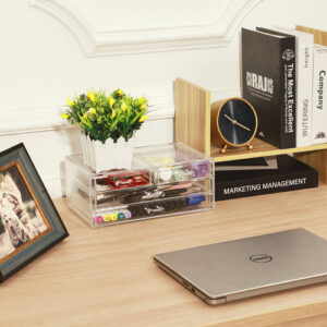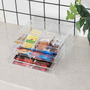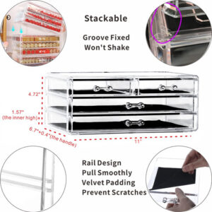 O projeto contém apenas o organizador. Use os melhores organizadores de cosméticos para organizar seu quarto e banheiro hoje. Então, você gostaria de escolher um projeto como investimento de longo prazo para uma mulher? Quase todos esses organizadores de maquiagem anunciados como acrílico são, na verdade, feitos de um material mais frágil chamado Poliestireno. Não usamos 'moldes de plástico' para produzir em massa o acrílico Cq – ele é meticulosamente feito à mão. O acrílico é transparente como vidro, tem uma aparência requintada e não lasca como o plástico. Com acrílico transparente da mais alta qualidade, o acrílico CQ é um produto exclusivo de alta qualidade e é, sem dúvida, um investimento de longo prazo para manter sua maquiagem cara segura, organizada e arrumada como ela merece ser. Quando você tem muita maquiagem e joias, sabe em primeira mão o quão difícil pode ser organizar tudo e mantê-lo unido e à mão quando você precisar. Felizmente, a caixa de cosméticos acrílico Cq está aqui para oferecer o melhor dos mundos em um estojo de armazenamento bonito e elegante. Projetada para guardar todos os seus acessórios de maquiagem favoritos e suas melhores joias, a caixa cosmética acrílica acrílica universal Cq oferece mais armazenamento e mais conveniência do que uma caixa de joias comum ou estojo de cosméticos. Com 3 gavetas grandes, você nunca mais precisará procurar seu batom, blush ou casamento em toda a casa ou no banheiro. Características e benefícios: Dimensões do organizador de acrílico 11 x 4,72 x 7,1 polegadas 3 gavetas armazenam maquiagem, batom, pincéis de maquiagem, joias e muito mais. Gavetas acolchoadas de malha. Alças fáceis de manusear. Limpa facilmente com água morna e um pano de lavagem Clique em “Adicionar ao carrinho” acima e adquira o seu hoje! – Organizador de maquiagem tamanho 11 “L x 7,1" L x 4,72" H, use individualmente ou empilhe para economizar espaço na penteadeira ou na banheira. Você pode empilhar todas as nossas gavetas de 11 polegadas de comprimento/combinação personalizada – Com 4 gavetas, gavetas de tamanhos diferentes, servem para armazenar paletas, perfumes, batons, brilhos labiais, esmaltes, joias e pincéis de maquiagem, hidratantes, máscaras e loções – Você também pode usar a gaveta sozinha, perfeita embaixo da pia do banheiro, para guardar bolas de algodão, cotonetes e loção. O organizador transparente de produtos para a pele permite que você veja com mais clareza o que precisa e organize todos os seus cosméticos e joias em uma penteadeira deslumbrante – Nós mesmos produzimos e vendemos, oferecemos o melhor preço, nossa equipe faz o melhor serviço, o melhor uso do acrílico. Se problemas de qualidade e danos no transporte, podemos escolher uma substituição ou reembolso, sem problemas, e é por isso que vem com uma garantia de satisfação de 30 dias