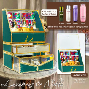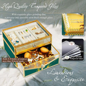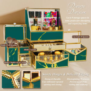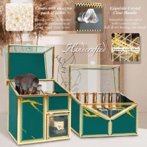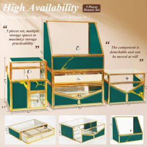 Apresentando nosso conjunto organizador de maquiagem de 5 peças, projetado para ajudar você a armazenar todos os seus itens essenciais e maximizar seu espaço! Com um design de grande capacidade, este conjunto pode conter muitos itens, reduzindo a desordem em sua sala de estar em até 90%. Além disso, o uso de mármore verde de alta qualidade e vidro temperado transparente garante que esses organizadores sejam à prova d'água e seguros para uso no banheiro. Coloque-os na bancada do organizador de maquiagem para facilitar o acesso a todos os seus produtos favoritos. Com este conjunto, seus cosméticos e ferramentas de beleza estarão organizados e ao seu alcance, facilitando a preparação! – – Experimente o luxo com nosso organizador de cosméticos de dupla camada de vidro temperado de alta qualidade e feito à mão – – Mantenha seus itens essenciais de beleza organizados com nosso organizador de cosméticos 5 em um com 1 compartimento superior alto, 1 gaveta de 3 compartimentos, 1 caixa de joias, 1 caixa de batons de 18 compartimentos e 1 organizador de pincéis de maquiagem com uma pérola grátis – – Maximize seu espaço com nossas vitrines de cosméticos de grande capacidade. Classifique e guarde seus vários cosméticos em gavetas diferentes para facilitar o acesso. – – Fique tranquilo com nosso organizador de penteadeira com design selado e forro de veludo cinza que protegem sua maquiagem e joias contra danos causados pela poeira e pela água. – – Ofereça um presente de luxo com nosso organizador de cosméticos e joias ideal para Dia dos Namorados, Dia das Mães, Dia de Ação de Graças, Natal, Aniversário e Casamento.