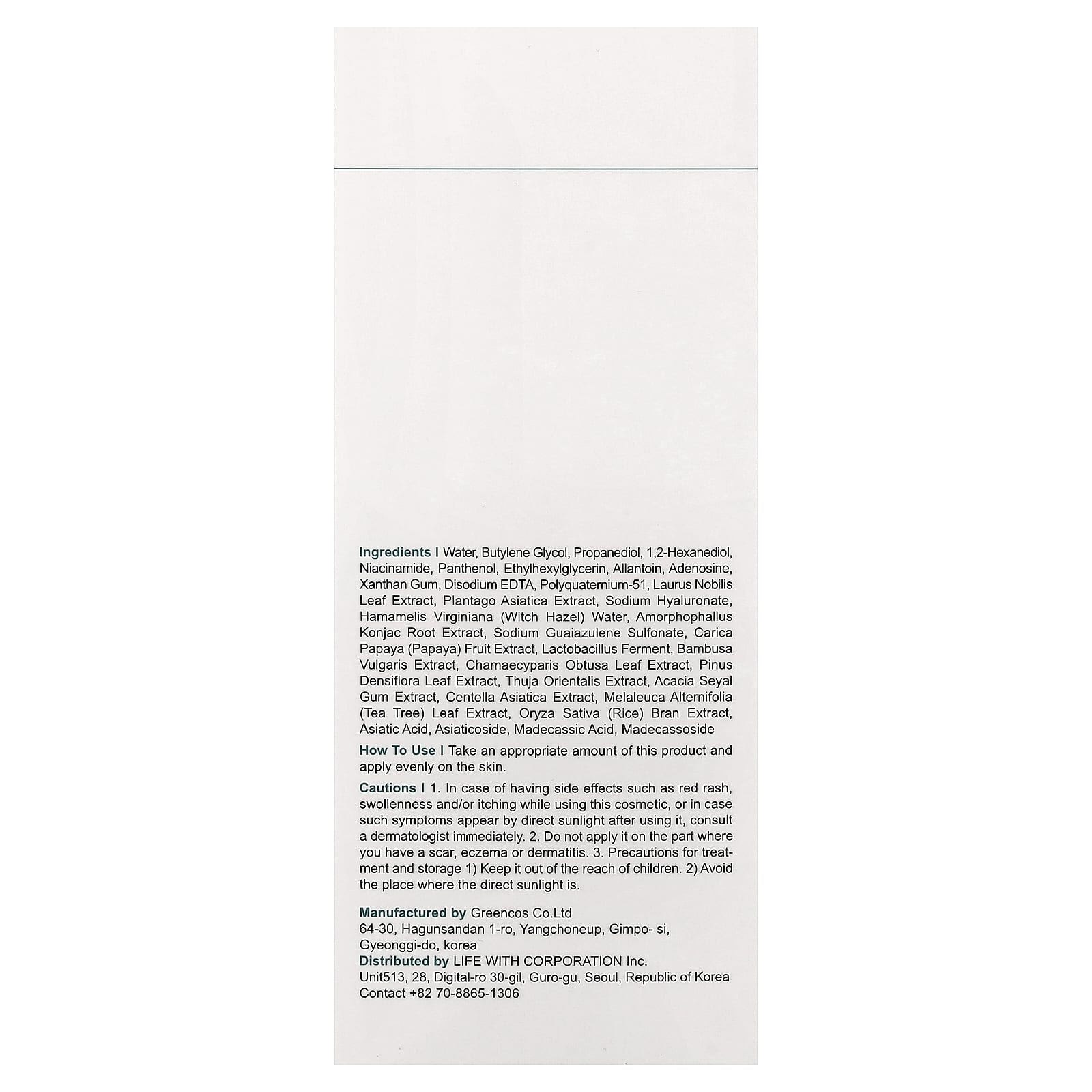 Água, butilenoglicol, propanediol, 1,2-hexanediol, nicotinamida, pantenol, ethylhexylglycerin, alantoína, adenosina, goma xantana, edetato dissódico, poliquatérnio-51, extrato da folha de Laurus nobilis, extrato de Plantago asiatica, hialuronato de sódio, água de Hamamelis virginiana (hamamélis), extrato da raiz de Amorphophallus konjac, guaiazuleno sulfonato de sódio, extrato da fruta de Carica papaya (mamão), fermento de lactobacillus, extrato de Bambusa vulgaris, extrato da folha de Chamaecyparis obtusa, extrato da folha de Pinus densiflora, extrato de Thuja orientalis, extrato da goma de acácia seyal, extrato de Centella asiatica, extrato da folha de Melaleuca alternifolia (melaleuca), extrato do farelo de Oryza sativa (arroz), asiatic acid, asiaticosídeo, ácido madecássico, madecassoside.