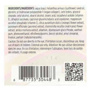 Aqua (eau), óleo da semente de Helianthus annuus (girassol), glicerina, polipeptídeo-1 sr-hydrozoan (colágeno vegano), cetyl esters, monoestearato de glicerila, álcool cetílico, álcool estearílico, ácido esteárico, acetato de tocoferol (vitamina E), diheptyl succinate, capryloyl glycerin/sebacic acid copolymer, magnesium ascorbyl phosphate (vitamina C), extrato da flor de Citrus aurantium dulcis (laranja), extrato de Jasminum officinale (jasmin), extrato da flor de Chamomilla recutita (matricária), extrato de Arnica montana, alantoína, dipotassium glycyrrhizate, goma xantana, fenoxietanol, ethylhexylglycerin, álcool benzílico, amyl cinnamal, linalol, perfume (natural/naturelle).