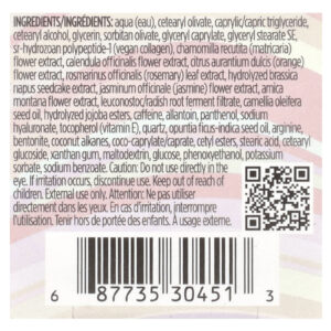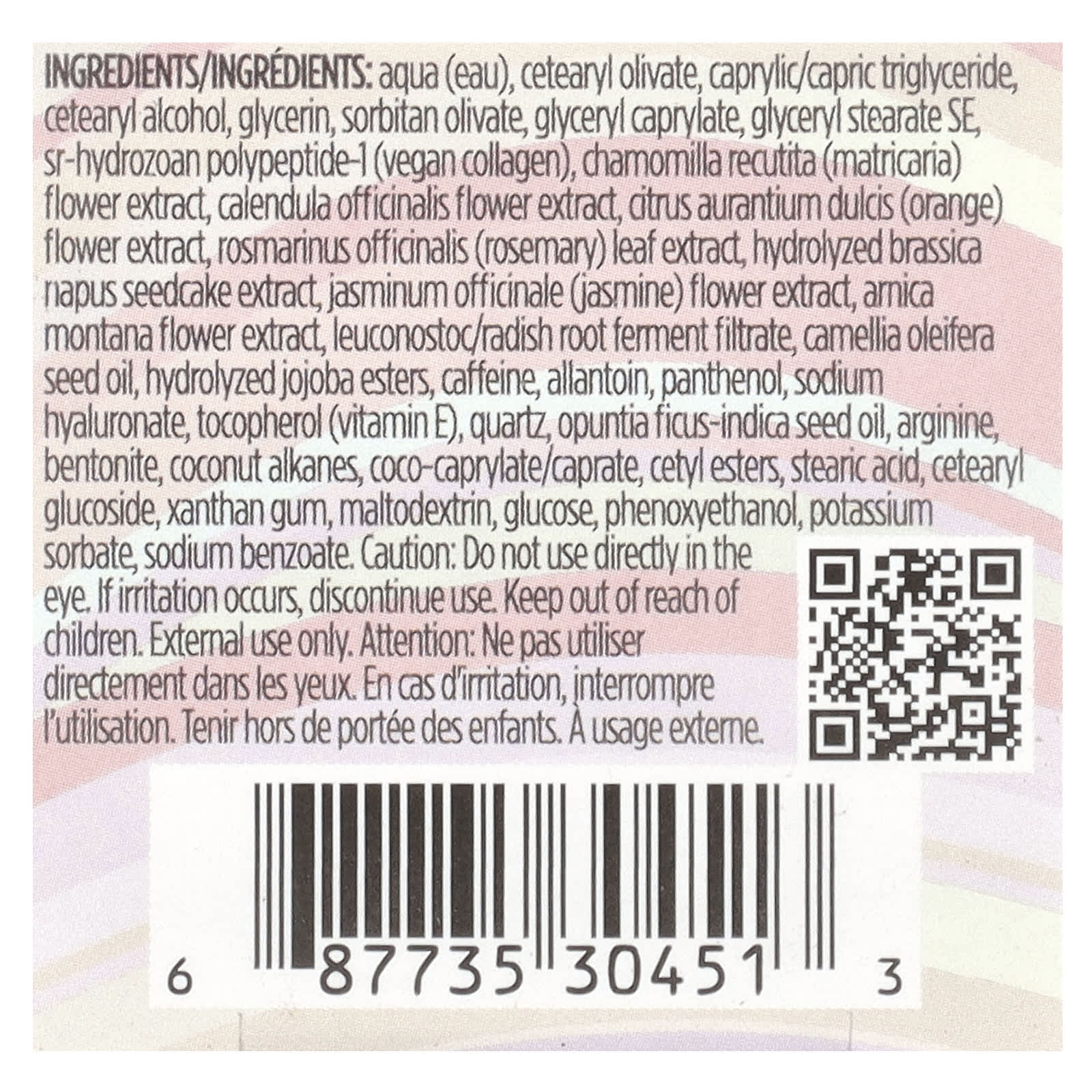 Aqua (eau), cetearyl olivate, caprylic/capric triglyceride, álcool cetoestearílico, glicerina, sorbitan olivate, caprilato de glicerila, monoestearato de glicerila autoemulsionável, polipeptídeo-1 sr-hydrozoan (colágeno vegano), extrato da flor de Chamomilla recutita (matricária), extrato da flor de Calendula officinalis, extrato da flor de Citrus aurantium dulcis (laranja), extrato da folha de Rosmarinus officinalis (alecrim), extrato de semente de Brassica napus hidrolisada, extrato da flor de Jasminum officinale (jasmim), extrato da flor de Arnica montana, filtrado da fermentação da raiz de rabanete/leuconostoc, óleo da semente de Camellia oleifera, ésteres de jojoba hidrolisados, cafeína, alantoína, pantenol, hialuronato de sódio, tocoferol (vitamina E), Quartzo, óleo da semente de Opuntia ficus-indica, arginina, bentonita, alcanos de coco, coco-caprylate/caprate, cetyl esters, ácido esteárico, glicopiranosídeo cetoestearílico, goma xantana, maltodextrina, glicose, fenoxietanol, sorbato de potássio, benzoato de sódio.