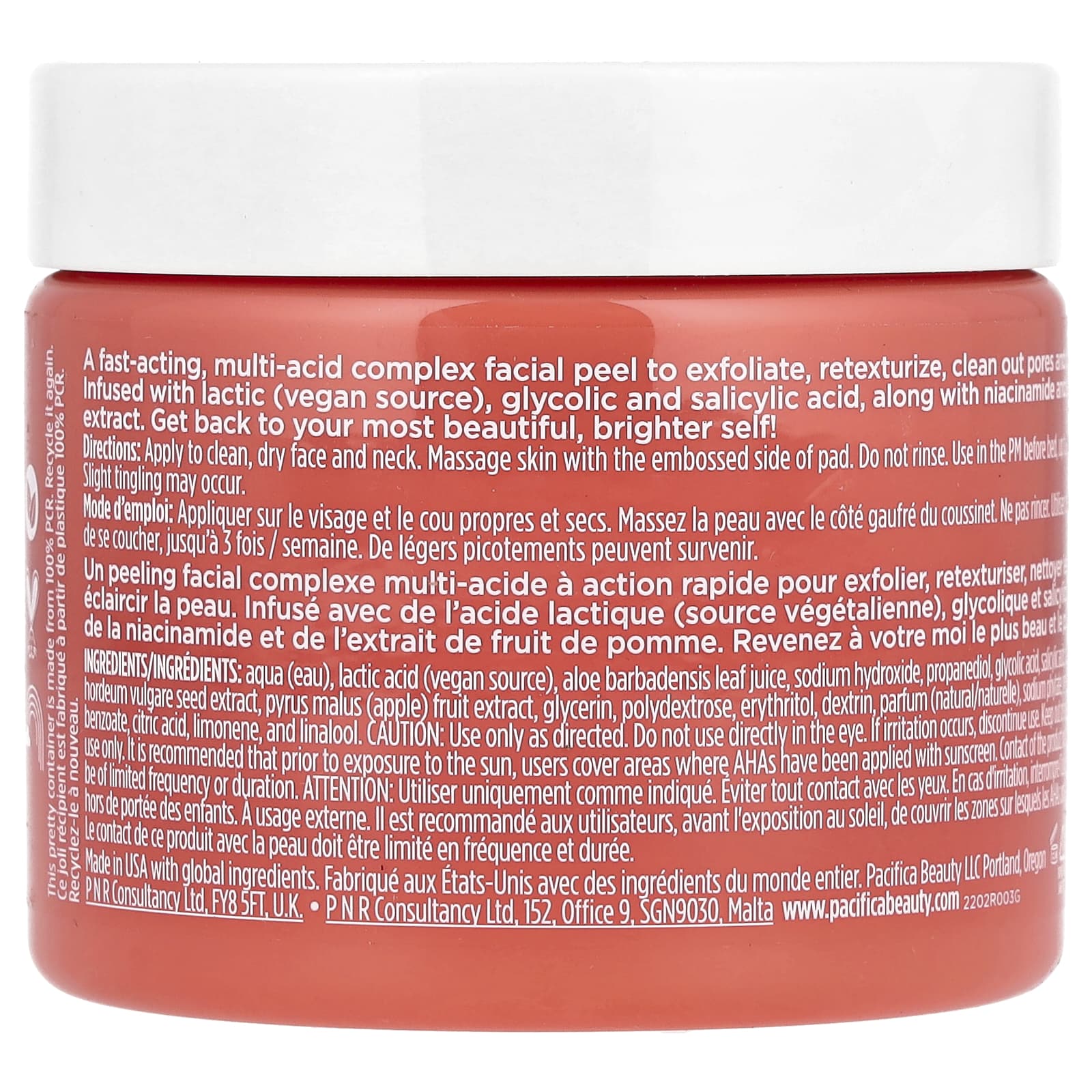 Um peeling facial com complexo multiácidos de ação rápida para esfoliar, retexturizar, limpar os poros e iluminar a pele. Infundido com ácido láctico (fonte vegana), ácido glicólico e ácido salicílico, junto com nicotinamida e extrato de maçã. Volte para a sua forma mais bonita e iluminada!