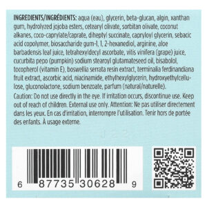 Aqua (eau), glicerina, betaglucano, algina, goma xantana, ésteres de jojoba hidrolisados, cetearyl olivate, sorbitan olivate, alcanos de coco, coco-caprylate/caprate, diheptyl succinate, capryloylglycerin, copolímero de ácido sebácico, goma de biossacarídeo-1,1, 2-hexanediol, arginina, suco da folha de Aloe barbadensis, tetrahexidecil ascorbato, suco da semente de Vitis vinifera (uva), óleo da semente de Cucurbita pepo (abóbora) sodium stearoyl glutamate, bisabolol, tocoferol (vitamina E), extrato da resina de Boswellia serrata, extrato da fruta de Terminalia ferdinandiana, ácido ascórbico, nicotinamida, ethylhexylglycerin, hietelose, gluconolactone, benzoato de sódio, perfume (natural/naturelle).