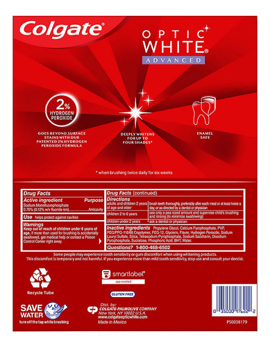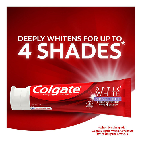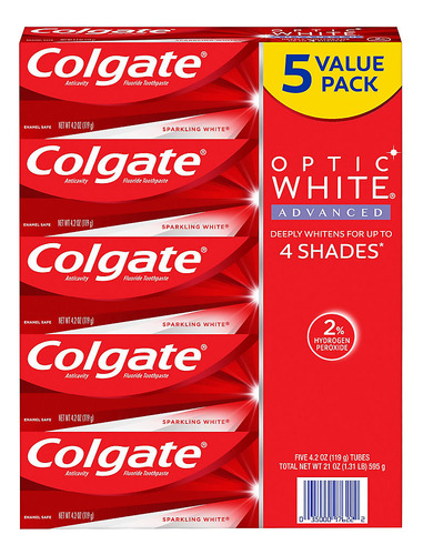 que funciona, escolha o creme dental Colgate Optic White Advanced Icy Fresh Hydrogen Peroxide O creme dental sem glúten inclui cinco tubos de 4,2 onças de pasta de dente Colgate Optic White Advanced Sparkling White