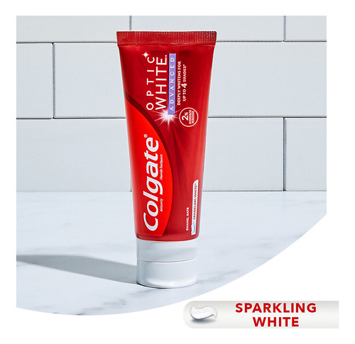 Seguro para esmalte e remove manchas de chá, café e vinho com 2% fórmula de peróxido de hidrogênio Colgate Optic White Advanced Sparkling White Hydrogen