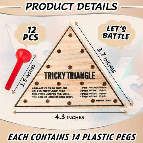 O jogo do triângulo de madeira é um brinquedo clássico que estimula a mente. Com apenas 4,5 polegadas por lado, este quebra-cabeça portátil é perfeito para pequenos espaços e mãos. Veja como a concentração e as habilidades de resolução de problemas das crianças melhoram. Horas de jogo de desenvolvimento o aguardam: mantenha-o na mesa de café ou leve-o para salas de espera e viagens. Se você está procurando entretenimento solo tranquilo ou diversão em família, o jogo de triângulo de madeira oferece quebra-cabeças acessíveis. – Teste de habilidade: domine este jogo divertido e desafiador que requer estratégia para eliminar pinos. – Estilo vintage: inspirado nos jogos de salão clássicos do passado, este jogo de triângulo de madeira traz um toque de nostalgia às noites de jogos em família. – Design compacto: com menos de 5 polegadas de largura, este jogo é facilmente guardado em uma gaveta quando não está em uso, ocupando um espaço mínimo. Ótimo para viajar. – Horas de entretenimento: adequado para maiores de 3 anos, jogadores jovens e idosos aproveitarão o suspense de equilibrar cuidadosamente mais triângulos, turno após turno. – Pacote com 12!