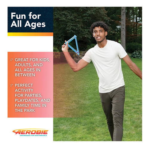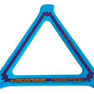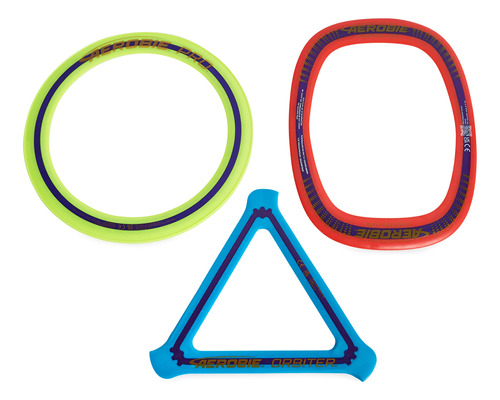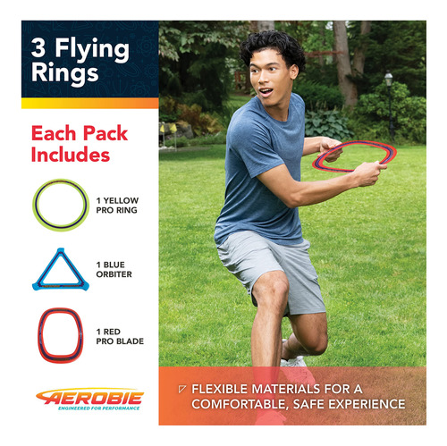 PACOTE DE 3 ANÉIS VOADORES: Inclui 1 anel Aerbie Pro de cor amarela, 1 bumerangue Aerbie Orbiter de cor azul e 1 anel Aerobie Pro Blade PRO de cor vermelha
