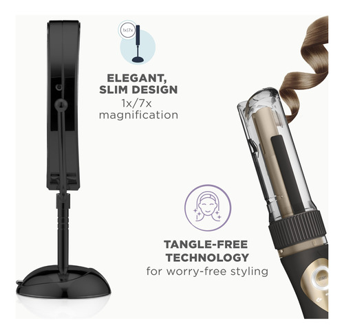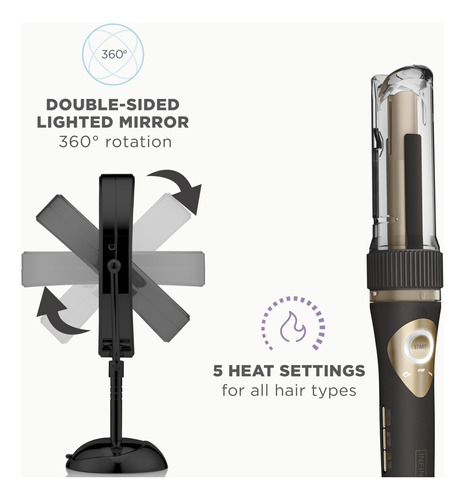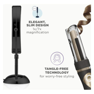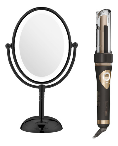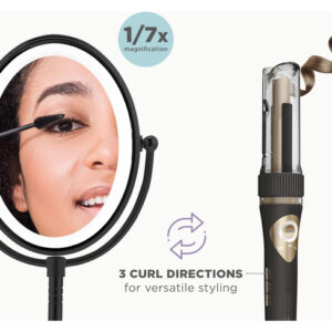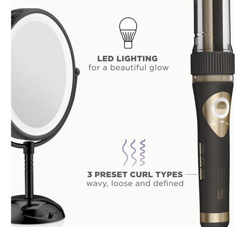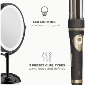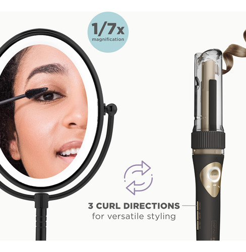 Pacote de edição limitada Conair | Ferro de frisar automático INFINITIPRO da CONAIR Curl Secret em cano de 3/4 polegadas – e – Espelho de maquiagem iluminado Conair | Preto | Exclusivo da Amazon – Hair Goes In, Curl Comes Out, Just Like Magic: uma forma revolucionária de criar lindos cachos. O modelador automático com tecnologia sem emaranhados atrai o cabelo com segurança para a câmara de ondulação, onde é segurado, cronometrado e aquecido suavemente para criar a ondulação perfeita. – O modelador cria cachos personalizados: escolha entre 1 dos 3 tipos de ondulação predefinidos (definidos, soltos ou ondulados), enquanto as 3 direções de ondulação (esquerda, direita ou alternada) permitem estilos versáteis. Tecnologia sem emaranhados com 5 configurações de aquecimento para todos os tipos de cabelo. – Espelho de maquiagem Picture Perfect: este espelho de maquiagem iluminado de dupla face apresenta ampliação de 1X e 7X, perfeito para aplicar maquiagem e pinçar com precisão e exatidão. O reflexo ficará distorcido/invertido se não estiver a menos de 6" do espelho. – Espelho de maquiagem iluminado: este espelho de maquiagem iluminado de dupla face operado por bateria usa uma lâmpada LED vitalícia que economiza energia. Ele fornece luz forte e as lâmpadas não queimam. – O pacote Amazon Exclusive 2024 de edição limitada com acabamento preto inclui modelador de cabelo automático Curl Secret de 3/4 polegadas e espelho de maquiagem iluminado com ampliação