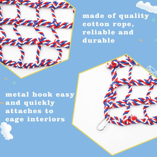 Ampla aplicação: esta colorida rede de corda de escalada para animais de estimação é muito adequada para todos os tipos de pássaros, papagaios, pombinhos, ratos, hamsters, calopsitas, chinchilas, furões, planadores açucareiros, esquilos e outros animais pequenos se levantarem, escalarem e brincarem, o perfeito decoração e acessório para gaiolas de pequenos animais. Tamanho e embalagem: O