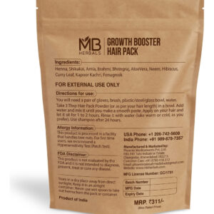 Pacote de cabelo MB Herbals Growth Booster – O pacote de cabelo MB Herbals Growth Booster contém henna misturada com 10 pós de ervas. – Sem coloração | Nosso pacote de cabelo não colore o cabelo – O pacote de cabelo Growth Booster contém uma mistura de ervas em pó para o cuidado do cabelo, como henna, shikakai, brahmi, amla, bhringraj, neem, aloe vera, hibisco, folhas de curry, feno Ugreek e Kapoor Kachri. – Os pós de ervas são cuidadosamente formulados para fornecer nutrição e condicionamento capilar. O Growth Booster Hair Pack ajuda no crescimento do cabelo. Reduz a queda de cabelo. Evita a fragilidade do cabelo. Melhora o volume do cabelo. – Instruções de uso: coloque 3 colheres de sopa de pó para cabelo (ou de acordo com o comprimento do cabelo) em uma tigela. Adicione água e misture até obter uma pasta lisa. Aplique no cabelo e deixe descansar por 1 a 2 horas. Enxágue com água (morna ou fria, como preferir). Use shampoo após 24 horas.
