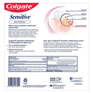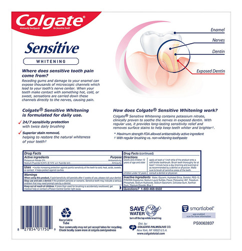 O creme dental branqueador sensível BW5EXP Colgate oferece todos os benefícios de um creme dental clareador e sensível em um para iniciar sua rotina diária de cuidados com o sorriso. Escovar para restaurar um sorriso naturalmente mais brilhante e obter alívio da sensibilidade clinicamente comprovado para a dor dos dentes sensíveis deve ser tudo menos comum. Este creme dental clareador funciona para polir as manchas superficiais, proporcionando ação de clareamento dental ao mesmo tempo em que deixa um hálito mais fresco. Experimente um sorriso mais brilhante sem sensibilidade.* Escovar e usar fio dental diariamente são hábitos essenciais se você quiser evitar problemas de saúde bucal, como doenças gengivais precoces e cáries. No entanto, se você tem dentes sensíveis, a linha Colgate Sensitive de cremes dentais sensíveis com alívio da sensibilidade pode ajudar! Formulados para dar aos dentes proteção de sensibilidade 24 horas por dia, 7 dias por semana**, esses cremes dentais antissensibilidade são a solução comprovada para reduzir a dor com alívio da sensibilidade de longa duração**, proteção da cavidade e sabor refrescante. O alívio nunca está longe com nossa linha de produtos Colgate Sensitive. Na Colgate, eles fabricam pasta de dente que promove sorrisos saudáveis. Não só porque ter um sorriso saudável é importante para sua saúde geral, mas porque quando você tem um sorriso saudável, você realmente sorri mais e isso é uma coisa poderosa. Sorrisos são a forma mais simples de otimismo, algo de que precisamos agora mais do que nunca.