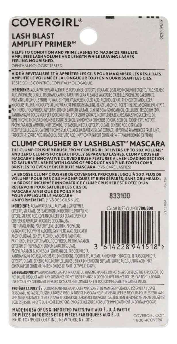 Pacote de primer de cílios COVERGIRL Clump Crusher e Lash Blast Amplify, 1 unidade, rímel, rímel de volume e comprimento, rímel alongador, dobro do volume, aumento instantâneo de cílios – O dobro do volume – O rímel de volume e comprimento com fórmula sem grumos dá aos cílios 20 vezes mais volume – PINCEL PENTEADOR GRUMP – O pincel de dupla face carrega os cílios enquanto remove grumos – INSTANT Lixing ASH BOOST — Ajuda os cílios a parecerem ainda mais longos e cheios — Cílios mais saudáveis — A fórmula do primer contém óleos nutritivos de argan, jojoba e coco para fortalecer e condicionar os cílios – CRUELDADE- GRÁTIS – Nossos produtos não são testados em animais
