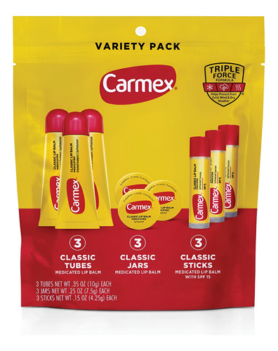 Pacote variado de 9 unidades, incluindo tubos de protetor labial medicamentoso Carmex Classic, bastões com protetor solar e frascos clássicos (3 tubos, 3 palitos, 3 frascos). Bálsamo hidratante de deslizamento suave para lábios secos e rachados, formulado com manteiga de cacau e mentol. Bálsamos labiais multiuso que protegem seus lábios rachados do frio, vento e clima seco. Bastões hidratantes com protetor solar que oferecem proteção labial SPF 15 (SPF somente em bastões).