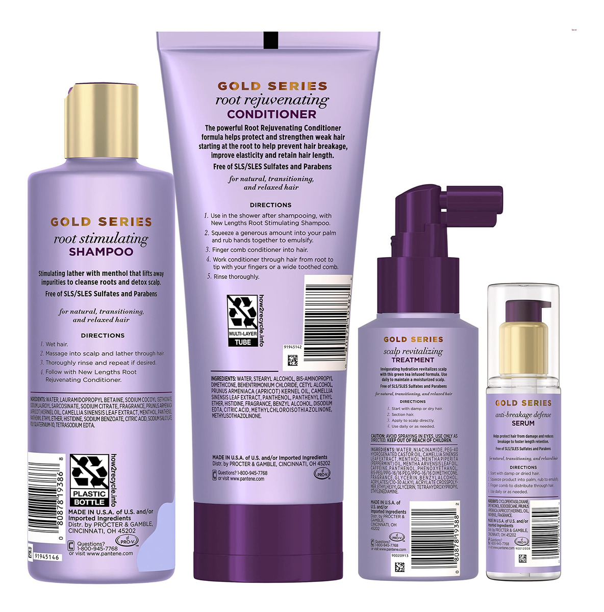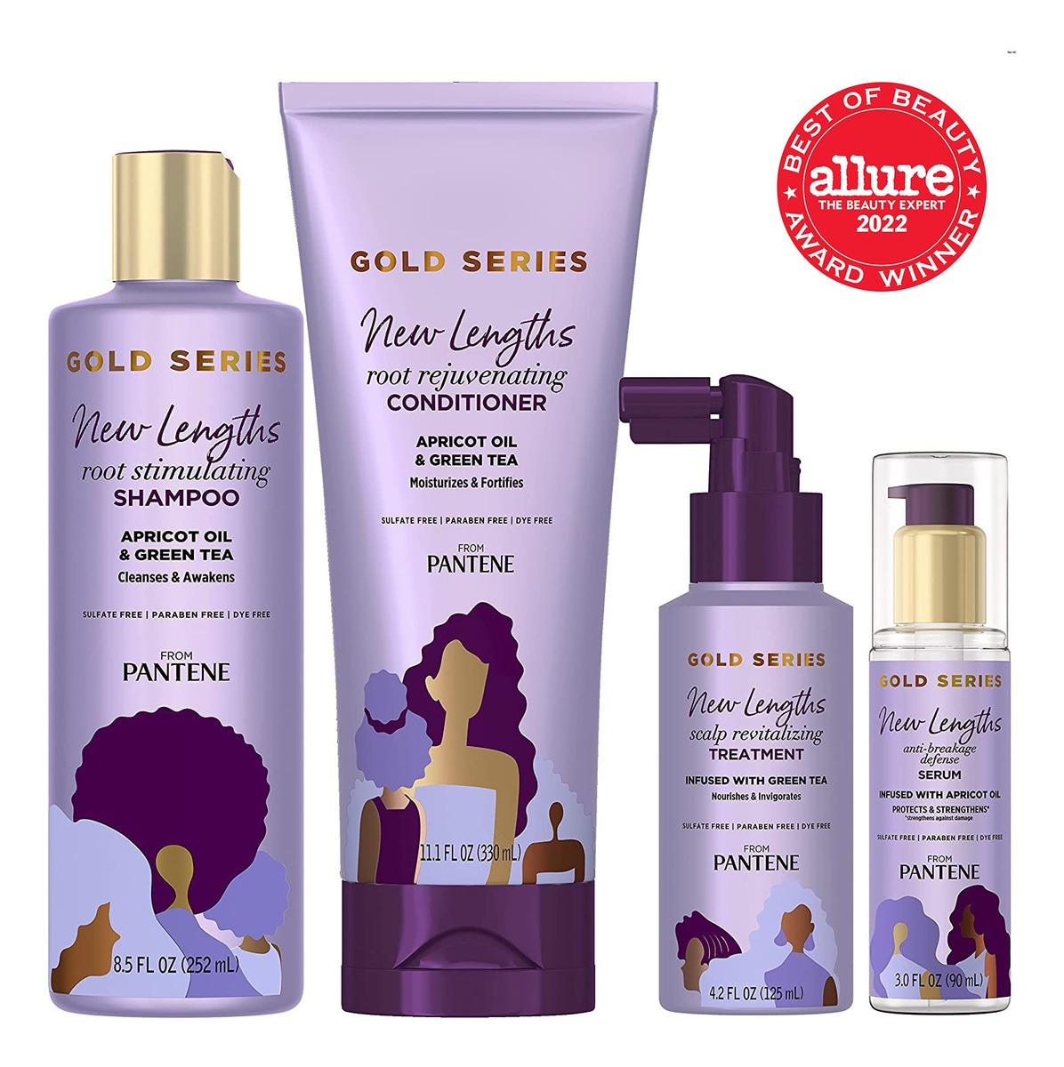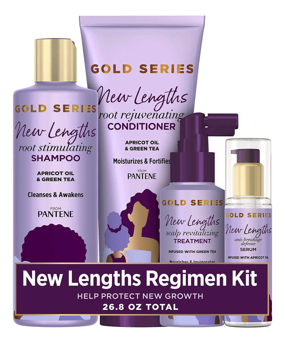 Pacote Pantene New Lengths com shampoo estimulante radicular, condicionador rejuvenescedor, tratamento revitalizante do couro cabeludo e sérum antiquebra, feito com óleo de damasco e chá verde, para cabelos naturais e encaracolados — Você receberá (1) frasco de 8,5 fl oz de shampoo estimulante radicular, (1) frasco de 11,1 fl oz de condicionador rejuvenescedor de raízes, (1) frasco de 4,2 fl oz de tratamento revitalizante do couro cabeludo e (1) 3 fl oz frasco de Sérum Anti-Breakage Defense – Vencedor do Allure Best of Beauty 2022 – Infundido com óleo de damasco e chá verde – O padrão-ouro em umidade, desenvolvido pela Black PhD cientistas e aperfeiçoado por cabeleireiros negros – Sem sulfatos, sem parabenos e sem corantes, sem sulfatos e parabenos SLS/SLES – Ajuda a condicionar cabelos fortes e flexíveis (resistência contra danos)