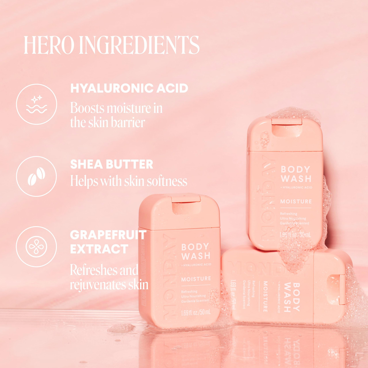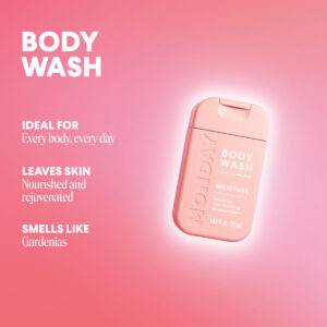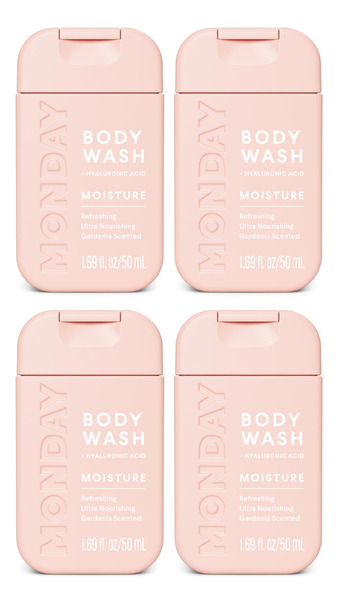 Pacote de viagem MONDAY Body Wash Moisture — 50 ml (pacote com 4) — Ingredientes nutritivos, manteiga de karité, óleo de coco e extrato de toranja, hidratam e reabastecem a pele — Lavagem corporal hidratante: com um aroma floral de gardênia, o sabonete líquido MONDAYS MOISTURE é infundido com uma mistura nutritiva de ácido hialurônico, manteiga de karité, óleo de coco e extrato de toranja. Projetado para todos os corpos, todos os dias – FÓRMULA DIÁRIA: Nossa fórmula diária de sabonete corporal é dermatologicamente testada, com pH balanceado e livre de sulfatos e parabenos. Em vez disso, contém ingredientes naturais hidratantes e suavizantes para reabastecer a pele e restaurar a hidratação. – PREMIADO: Nossa linha tem 16 grandes prêmios de beleza, incluindo o prêmio Allure 2023 Best of Beauty, o prêmio InStyle 2022 Best Beauty Buy, o Glamour 2021 Beauty Award e o Cosmo 2021 Holy Grail Beauty Award. – CERTIFICADO COMO LIVRE DE CRUELDADE: todos os produtos da Monday são aprovados como livres de crueldade pelo programa Leaping Bunny pela Cruelty Free International. Também temos orgulho de sermos reconhecidos pela PETA como uma marca que não testa em animais. – GARRAFAS 100% RECICLÁVEIS: nossas pequenas garrafas rosa não só ficam ótimas no seu chuveiro, mas também são feitas de plástico 100% reciclável para ajudar a minimizar a pegada de carbono e reduzir o aterro sanitário. Uma vitória para sua rotina de beleza e para o meio ambiente.