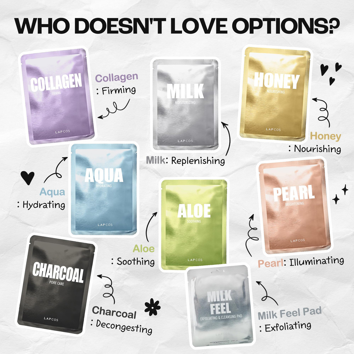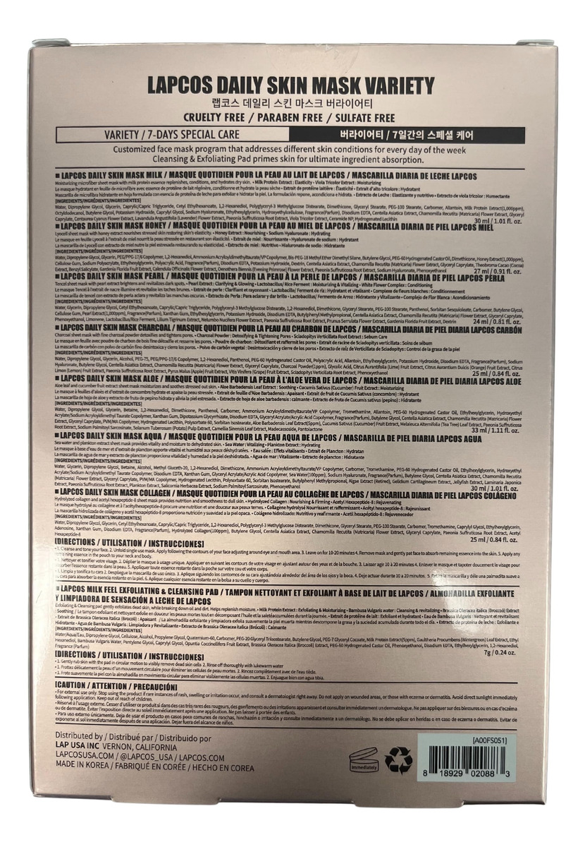 Pacote variado de máscaras diárias LAPCOS 7+1 – Versão 1 Um deleite para sua pele, nossas sete máscaras para melhorar a pele fornecem à pele os superalimentos e nutrientes que ela deseja. Este programa foi formulado para aumentar a resiliência e aumentar o brilho de todas as tezes, independentemente do que sua pele precise. O pacote inclui: 1 máscara de colágeno; 1 máscara de leite; 1 peça de máscara de mel; 1 máscara aquática; 1 máscara de aloe; 1 máscara de pérola; 1 peça de máscara de carvão vegetal; 1 peça de almofada esfoliante e de limpeza de carvão vegetal — Cuidados com a pele personalizados: dê à sua pele o que ela deseja com nosso pacote variado de máscaras de lençol, um programa completo de máscaras faciais de beleza desenvolvido para tratar diferentes condições de pele em todos os dias da semana e em todas as partes do dia. – 7 máscaras diárias: este conjunto de máscaras de lençol inclui 1 máscara diária de 1 pacote: colágeno, leite, mel, água, babosa, pérola e carvão vegetal para clarear a pele, nutrir a secura, aperte, revitalize e melhore a textura da pele. – 1 almofada facial esfoliante: a textura macia e o esfoliante da nossa almofada de limpeza Milk Feel deixarão uma tez limpa e revigorada, alimentada pelo extrato de proteína do leite, para uma pele limpa e clara. – COMO USAR: Comece com a almofada facial no primeiro dia para limpar e esfoliar a pele, depois escolha a máscara facial que melhor se adapta às suas necessidades, seja é hidratante, suavizante ou reafirmante para a pele. – K-BEAUTY ESSENTIAL – Uma marca cult favorita, criada com ingredientes da mais alta qualidade e dedicação intransigente à inovação em beleza e cuidados com a pele.