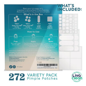 Pacote de variedades Pimple Patches — PIMPLE BE GONE! – Elimine o pus e as impurezas com nossos adesivos hidrocolóides em menos de 8 horas. 10 adesivos diferentes para qualquer emergência de acne. Fácil de guardar em qualquer bolsa ou kit de banheiro. – FÓRMULA PODEROSA – Os adesivos hidrocolóides para acne Livaclean são infundidos com óleo de melaleuca, ácido salicílico e óleo de calêndula. Este poderoso trio elimina manchas, mas também combate manchas escuras, também conhecidas como hiperpigmentação, deixando sua pele clara e radiante. – BIG CLUSTER BACKUP – Nossas grandes manchas de espinhas foram projetadas pensando em erupções cutâneas. As fugas não acontecem em um único local. A variedade de adesivos para espinhas pode ser usada em qualquer lugar, como rosto, testa, queixo e corpo. – MAIS ADESIVOS, MAIS VALOR – Liberte o poder de 272 adesivos em nosso pacote de variedades de adesivos para espinhas. É o melhor valor para fortalecer o rosto, o queixo, o nariz e o corpo contra manchas. – MODO AM/PM: manchas noturnas mais espessas permanecem fortes durante toda a noite se mexendo e girando. Embora nosso adesivo diurno tenha um acabamento fosco translúcido mais fino que permanece fora de vista. – Sinta-se bem – Livre de crueldade, sem silicone, sem óleo mineral, sem sulfato, sem cores artificiais, sem álcool, sem testes em animais e com o mínimo de desperdício. E em breve você estará livre de Whitehead! Temos tudo o que você precisa!