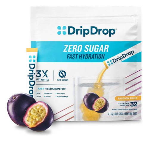DripDrop Zero Sugar is a great-tasting, doctor-developed electrolyte powder packet that provides superior hydration that works faster and more effectively than water alone. Our Zero Sugar formula provides 3X the electrolytes of the leading sports drink. DripDrop Zero Sugar delivers precise levels of sodium electrolytes for fast fluid absorption and daily hydration health. Our formula contains essential electrolytes, including sodium, potassium, and magnesium, for fast hydration. B vitamins (B3, B5, B6, B12) for healthy energy and metabolism. Plus, vitamin C and zinc for optimized wellness and added immune support. DripDrop is fast hydration for exercise, heat, cold weather, altitude, travel, sleep and more. Loved by dieticians, nutritionists, athletes, new moms, and people on the move who want fast hydration with zero sugar. – FAST & EFFECTIVE HYDRATION: Combat dehydration with our science-based formula that hydrates faster than water alone. Perfect for sports, outdoor activities, and hot days. – 3X ELECTROLYTES & ZERO SUGAR Our precise level of sodium electrolytes and low particle-to-solution concentration ensure fast hydration. Tasty hydration thats easy to drink and mix. – HEALTH-CONSCIOUS FORMULA: Non-GMO, Gluten-Free, Vegan, Soy-Free, Dairy-Free and Kosher. Includes essential nutrients like potassium, magnesium, zinc, and vitamin C for added immune support, plus vitamins B3, B5, B6, and B12 for healthy energy and metabolism. – CONVENIENT SINGLE-SERVE PACKETS: 32 Passion Fruit flavored portable packets perfect for on-the-go hydration. Ideal for travel, sports activities, and daily use. Mix 1 packet into 8 oz of water for effective hydration. – TRUSTED BRAND WITH A MISSION: Created by a doctor, DripDrop is a groundbreaking innovation that earned a Mayo Clinic Humanitarian Award. As a Public Benefit Company, every purchase supports our mission to defeat dehydration with global donations of our product. – DELICIOUS FLAVOR: Awarded Mens Journal Fitness Award for the Best-Tasting Hydration Drink. Explore our many flavors and find your favorite!