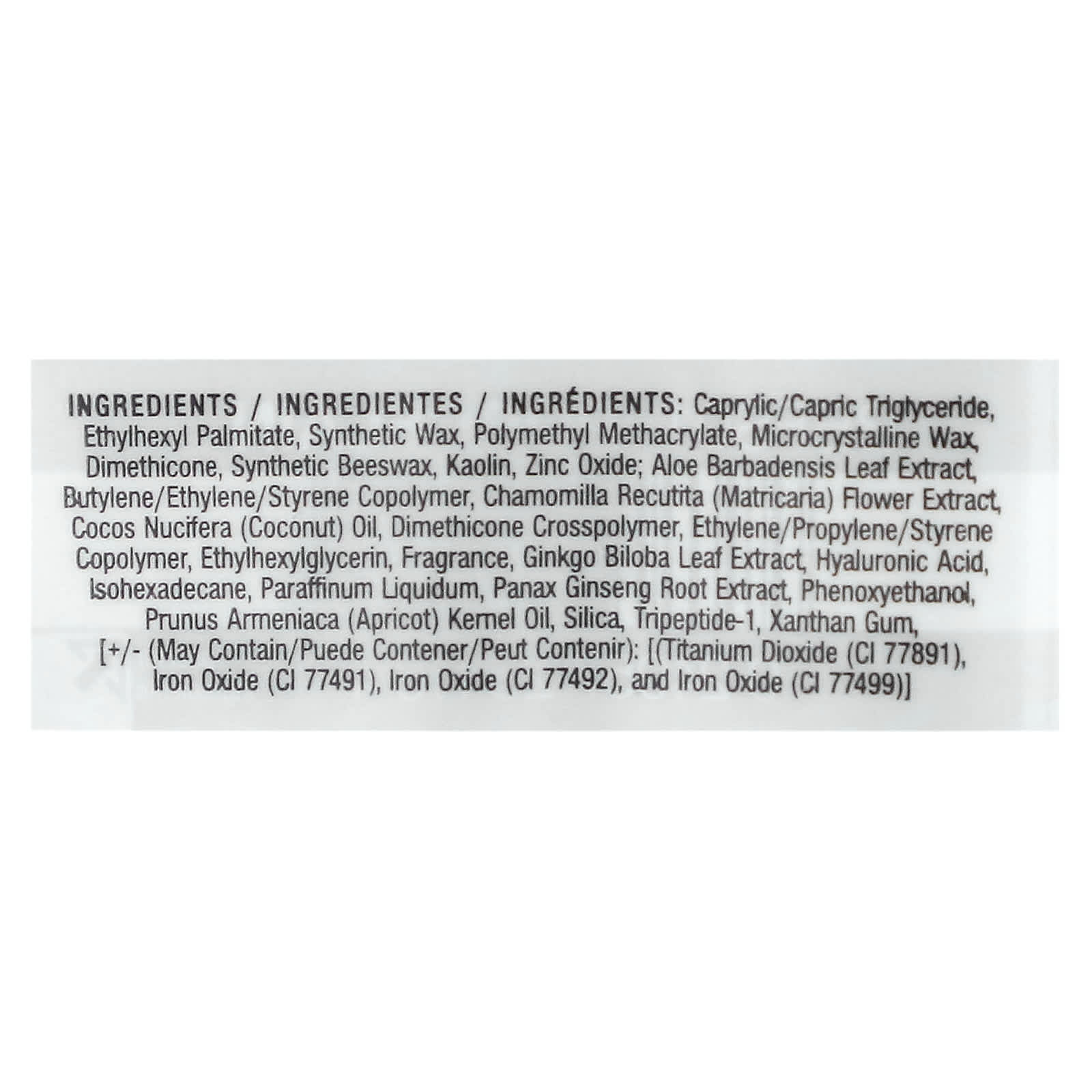 Caprylic/capric triglyceride, ethylhexyl palmitate, cera sintética, polymethyl methacrylate, cera microcristalina, dimeticona, cera de abelha sintética, caulim, óxido de zinco; extrato da folha de Aloe barbadensis, copolímero de butileno/etileno/estireno, extrato da flor de Chamomilla recutita (matricária), óleo de Cocos nucifera (coco), polímero cruzado de dimeticona, ethylene/propylene/styrene copolymer, ethylhexylglycerin, fragrância, extrato da folha de Ginkgo biloba, ácido hialurônico, isohexadecane, paraffinum liquidum, extrato de raiz de Panax ginseng, fenoxietanol, óleo da semente de Prunus armeniaca (damasco), sílica, tripeptide-1, goma xantana, [+/- (pode conter: dióxido de titânio) (CI 77891), óxido de ferro (CI 77491), óxido de ferro (CI 77492), e óxido de ferro (CI 77499)]