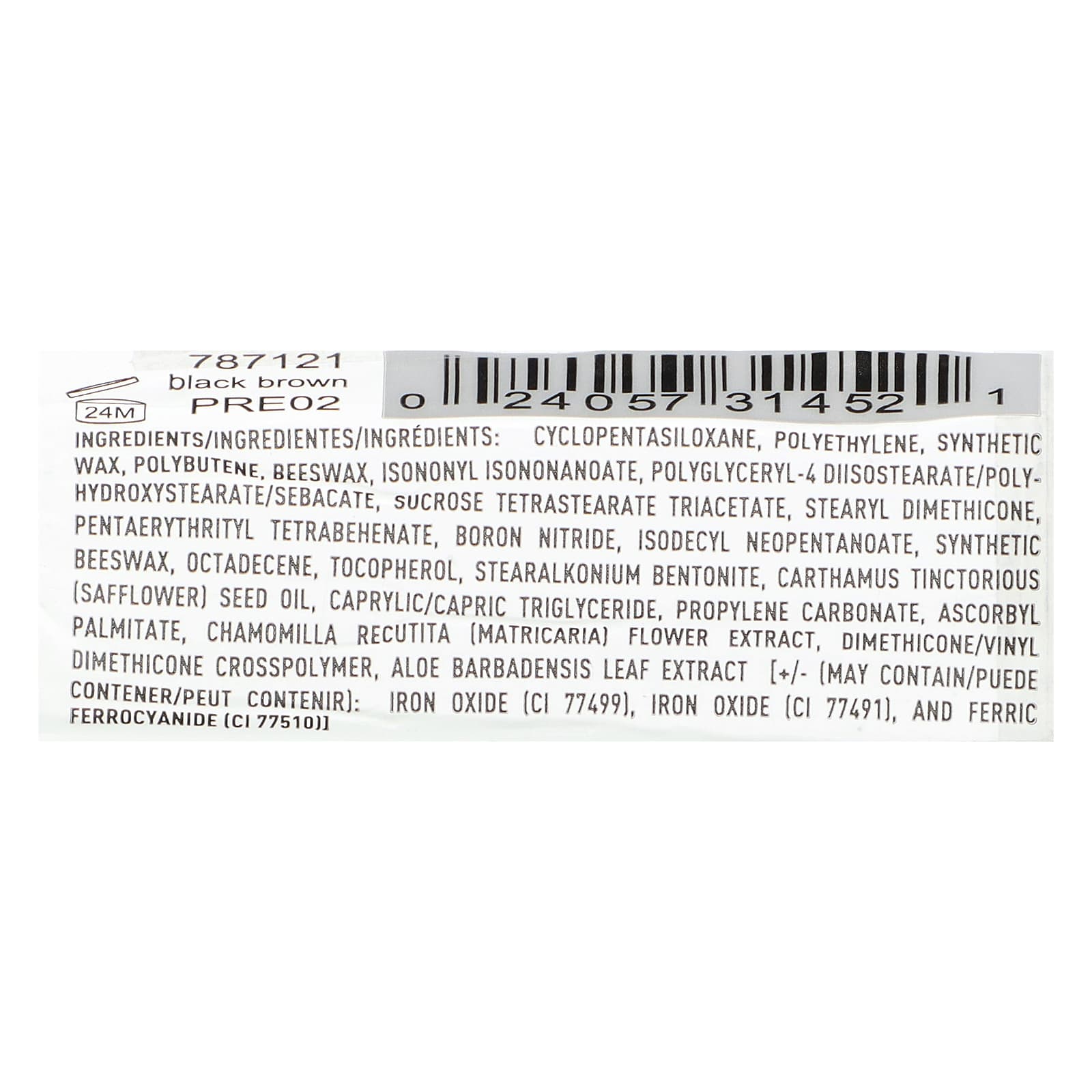 Decametilciclopentasiloxano, polietileno, cera sintética, polybutene, cera de abelha, isononyl isononanoate, diisostearato de poliglicerila-4 / poli-hidroxiestearato / sebacato, sucrose tetrastearate triacetate, dimeticona estearilo, pentaerythrityl tetrabehenate, nitreto de boro, neopentanoato de isodecila, cera de abelha sintética, octadeceno, tocoferol, bentonite de stearalkonium, óleo da semente de Carthamus tinctorious (cártamo), caprylic/capric triglyceride, carbonato de propileno, palmitato de ascorbila, extrato da flor de Chamomilla recutita (matricária), dimethicone/vinyl dimethicone crosspolymer, extrato da folha de aloe barbadensis [+/- [pode conter / puede contener / peut contenir): óxido de ferro (CI 77499), óxido de ferro (CI 77491), e ferrocianeto férrico (CI 77510)].
