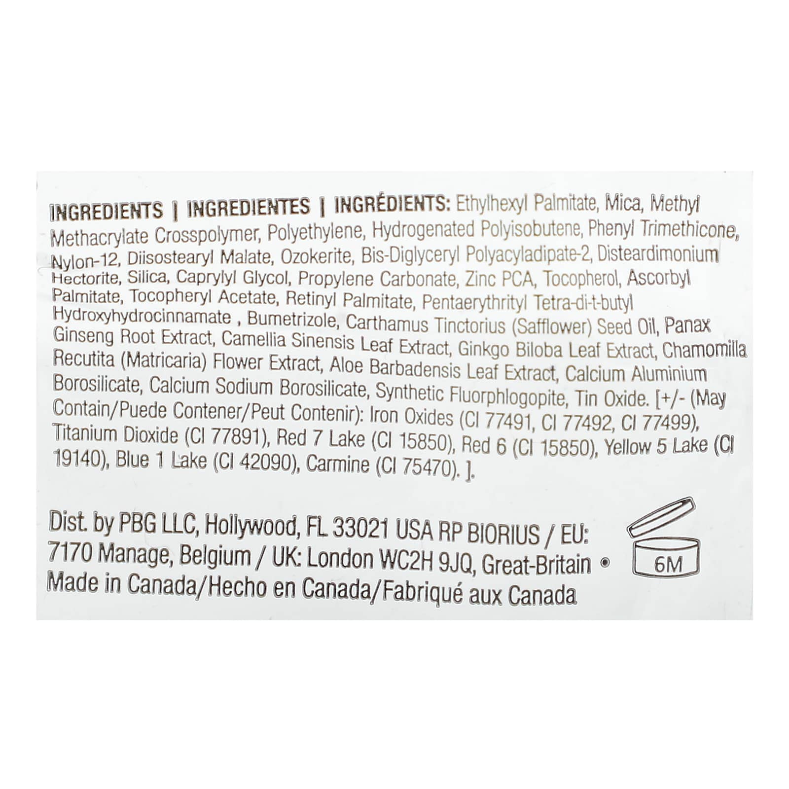 Ethylhexyl palmitate, mica, copolímero de dimetacrilato de etilenoglicol e metacrilato de metila, polietileno, hydrogenated polyisobutene, phenyl trimethicone, náilon-12, diisostearyl malate, ozocerita, bis-diglyceryl polyacyladipate-2, disteardimonium hectorite, sílica, caprylyl glycol, carbonato de propileno, zinco pca, tocoferol, palmitato de ascorbila, acetato de tocoferol, palmitato de retinol, pentaerythrityl tetra-di-t-butyl hydroxyhydrocinnamate , bumetrizol, óleo da semente de Carthamus tinctorius (cártamo), extrato de raiz de Panax ginseng, extrato da folha de Camellia sinensis, extrato da folha de Ginkgo biloba, extrato da flor de Chamomilla recutita (matricária), extrato da folha de Aloe barbadensis, calcium aluminum borosilicate, calcium sodium borosilicate, synthetic fluorphlogopite, óxido de estanho. [+/- (pode conter): óxidos de ferro (ci 77491, CI 77492, CI 77499), dióxido de titânio (CI 77891), vermelho 7 laca de cálcio (CI 15850), vermelho rubi (CI 15850), amarelo 5 lago (c) 19140), azul brilhante laca de alumínio (CI 42090), carmim (CI 75470). ]