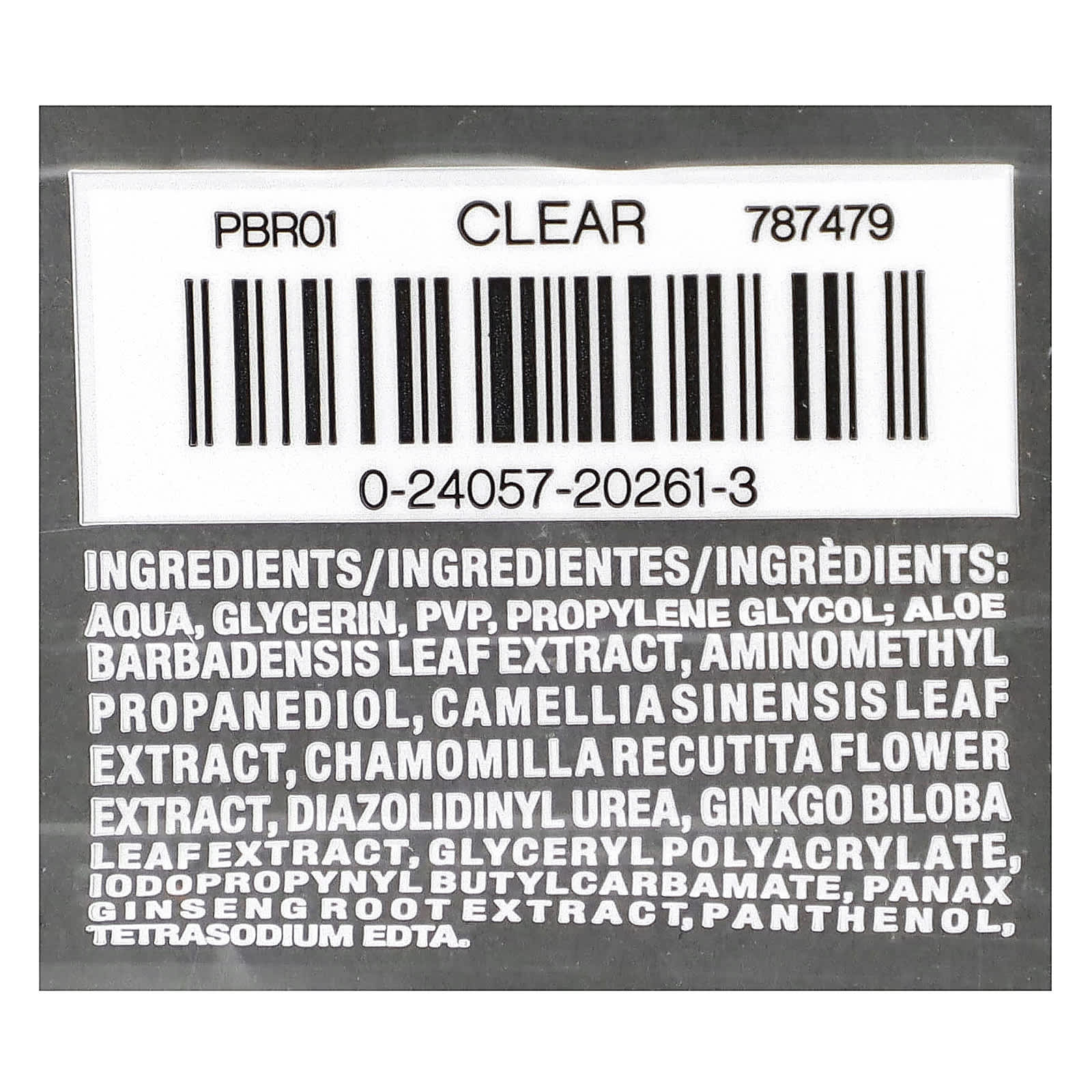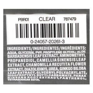 Aqua, glicerina, PVP, propilenoglicol; extrato da folha de Aloe barbadensis, aminomethyl propanediol, extrato da folha de Camellia sinensis, extrato da flor de Chamomilla recutita, diazolidinyl urea, extrato da folha de Ginkgo biloba, glyceryl polyacrylate, iodopropynyl butylcarbamate, extrato da raiz de panax ginseng pantenol, EDTA tetrassódico.