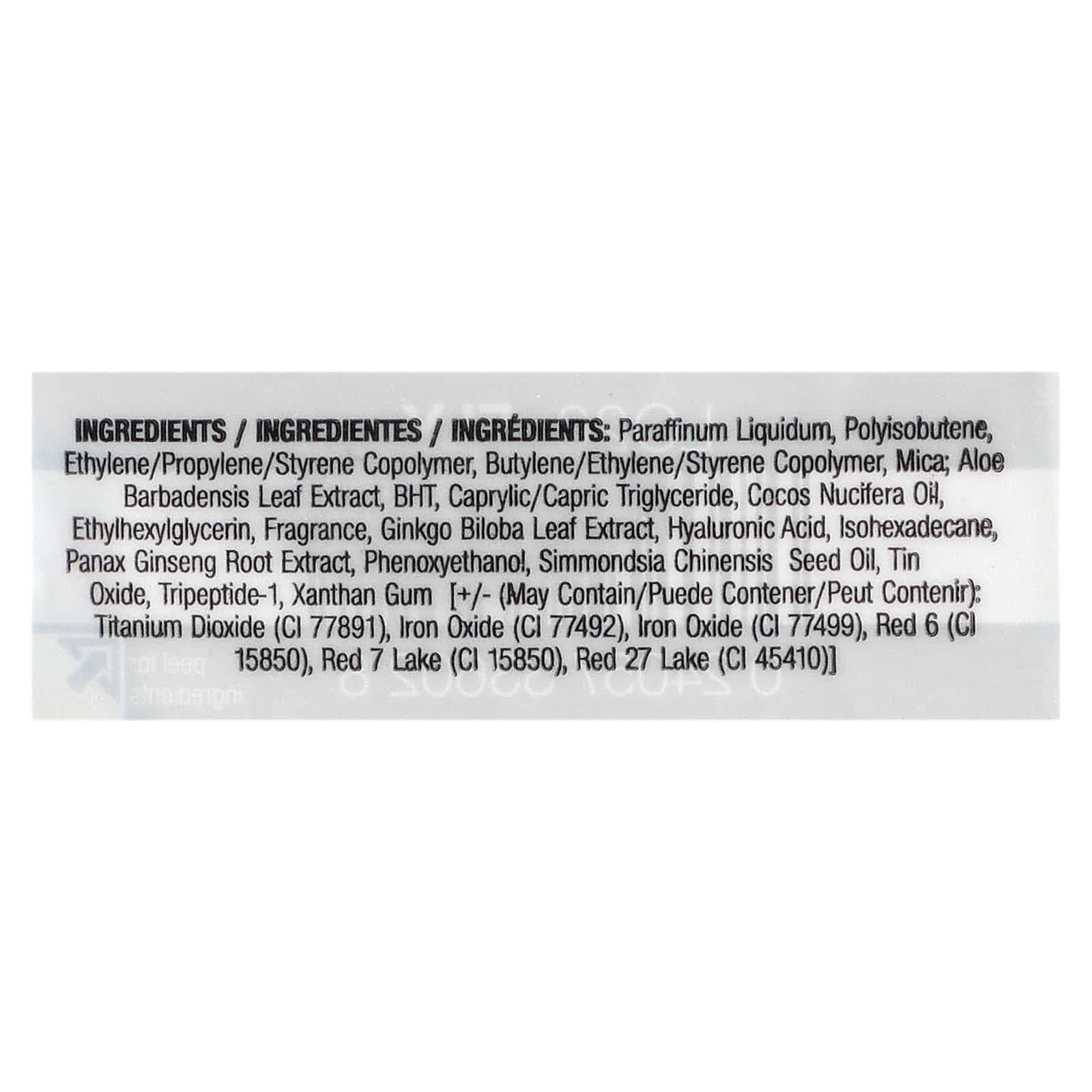 Paraffinum liquidum, poli-isobutileno, ethylene/propylene/styrene copolymer, copolímero de butileno/etileno/estireno, mica; extrato da folha de Aloe barbadensis, bht, caprylic/capric triglyceride, óleo de Cocos nucifera, ethylhexylglycerin, fragrância, extrato da folha de Ginkgo biloba, ácido hialurônico, isohexadecane, extrato de raiz de Panax ginseng, fenoxietanol, óleo da semente de Simmondsia chinensis, óxido de estanho, tripeptide-1, goma xantana [+/- (pode conter): dióxido de titânio (CI 77891), óxido de ferro (CI 77492), óxido de ferro (CI 77499), vermelho 6 (c) 15850), vermelho 7 laca de cálcio (CI 15850), vermelho 27 lago (CI 45410)].