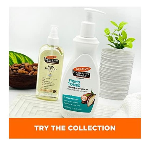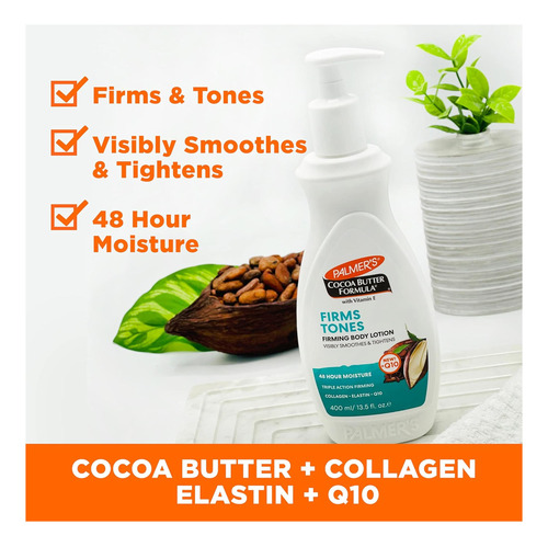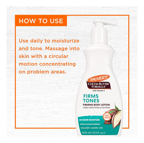 • Loção Firmadora para a Pele: Especialmente elaborada com Manteiga de Cacau, Vitamina E mais Colágeno, Elastina e Q10, esta loção corporal reafirmante para a pele firma e tonifica visivelmente a pele para tratar a perda de rigidez, elasticidade ou ondulações