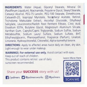 Por mais de 175 anos a Palmer’s® tem elaborado produtos de qualidade que corrigem visivelmente a descoloração, como manchas senis, manchas escuras de danos causados pelo sol e cicatrizes pós-acne. Agora com Retinol, esta potência antienvelhecimento ajuda a melhorar visivelmente a maleabilidade e a elasticidade da pele e a minimizar a aparência de linhas de expressão. O resultado é uma pele perfeitamente luminosa.