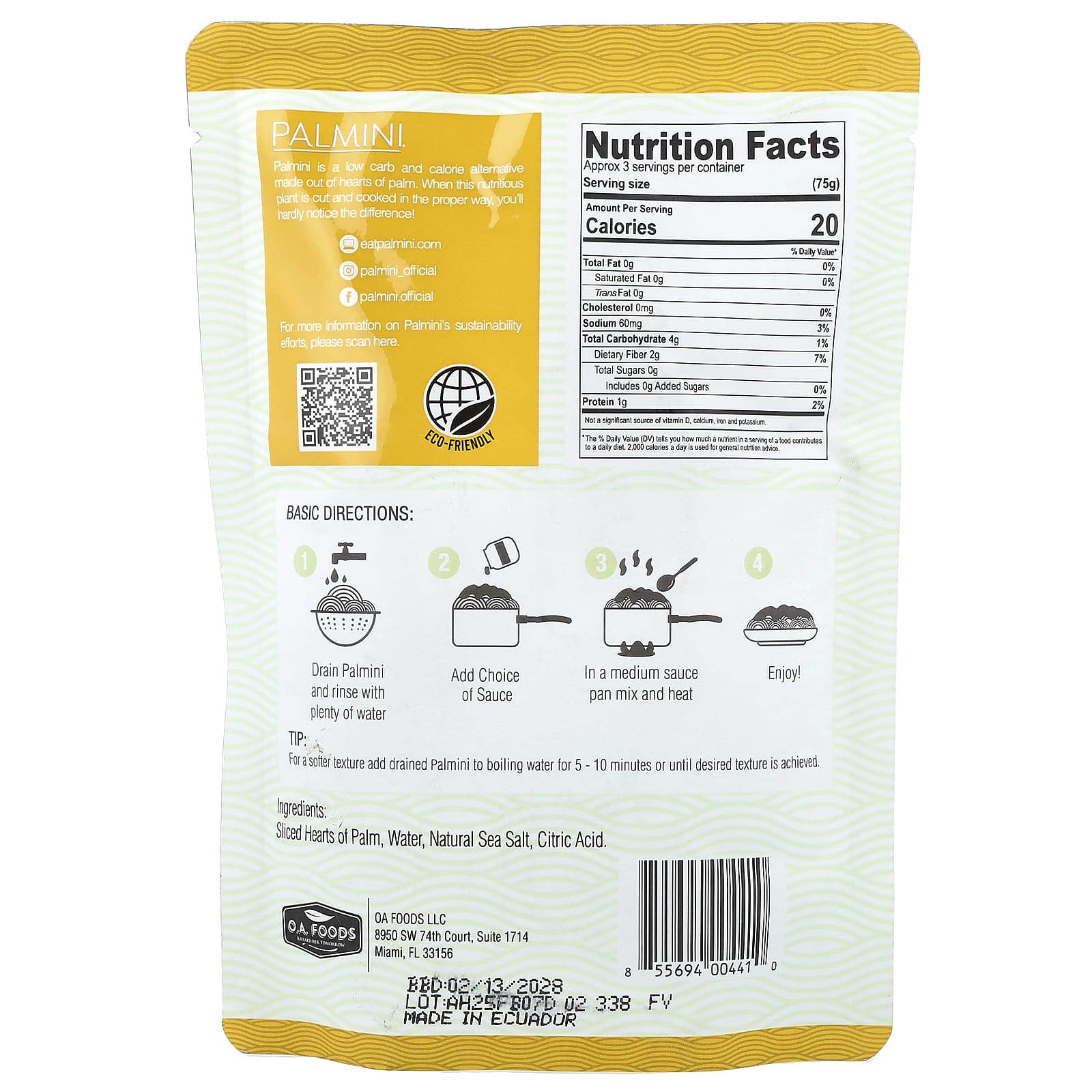 Dica: Para obter uma textura mais macia, adicione o Palmini drenado à água fervente por 5 a 10 minutos, ou até alcançar a textura desejada.