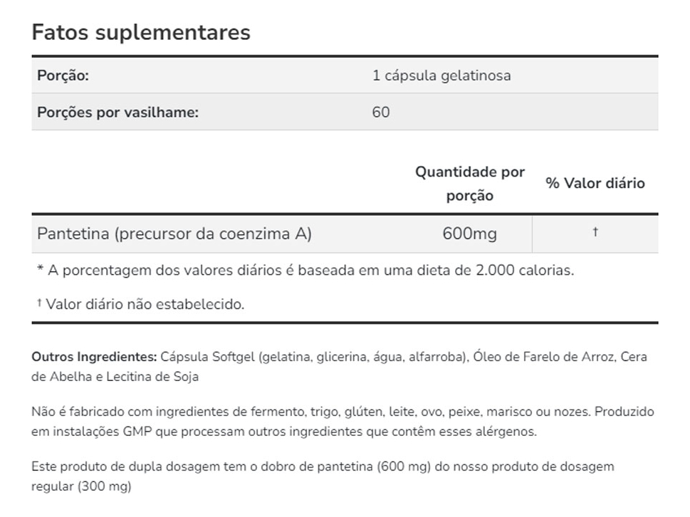 1. Suporte Nutricional Avançado: A Pantetina 600mg da Now Foods é um suplemento nutricional projetado para complementar sua rotina diária. Cada dose oferece suporte avançado, sendo ideal para quem busca um complemento eficaz e baseado em pesquisas.