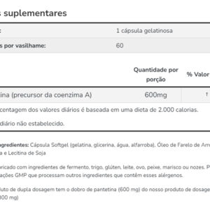1. Suporte Nutricional Avançado: A Pantetina 600mg da Now Foods é um suplemento nutricional projetado para complementar sua rotina diária. Cada dose oferece suporte avançado, sendo ideal para quem busca um complemento eficaz e baseado em pesquisas.