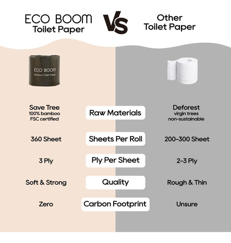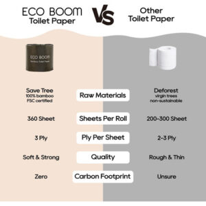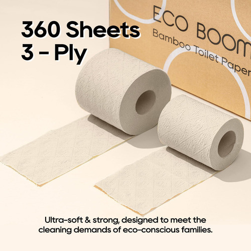 Apresentamos o papel higiênico ECO BOOM 100% bambu, a escolha ideal para quem se preocupa com o meio ambiente e sua saúde pessoal. Este papel higiênico é totalmente biodegradável e certificado pelo FSC, garantindo que não prejudique o meio ambiente de forma alguma. A embalagem do produto é totalmente desprovida de plástico, o que o torna uma opção verdadeiramente ecológica. Acreditamos em mantê-lo natural e é por isso que não branqueamos esse papel higiênico de bambu. Ele foi projetado para manter sua cor original, dando-lhe uma aparência mais natural. Ao fazer isso, ajudamos a preservar o meio ambiente para as gerações futuras. Além disso, o papel higiênico ECO BOOM é livre de substâncias químicas nocivas, como cloro, pesticidas, BPA e especiarias. Também não tem cheiro, o que significa que não há fragrâncias adicionais que possam causar alergias ou irritações. Junte-se a nós na tomada de uma decisão consciente em direção a um futuro mais sustentável e escolha o papel higiênico de bambu ECO BOOM para um mundo melhor. – 100% bambu e sustentável: o papel higiênico ECO BOOM é feito de 100% bambu, tornando-o a escolha mais ecológica. Inclui 9 rolos por caixa. – 3 camadas sem árvores: ultramacio e forte. Embalado individualmente em embalagens biodegradáveis, recicláveis e sem plástico. – Reduza sua pegada de carbono: apoie a sustentabilidade e forneça banheiros limpos para os necessitados em todo o mundo. – Feito de forma sustentável: livre de árvores, fragrâncias, cloro, plástico, tintas e corantes. Bom para você e para o meio ambiente. – Nossa visão: Nosso objetivo é enfrentar desafios globais, como mudanças climáticas e escassez de recursos, promovendo produtos ecologicamente corretos.