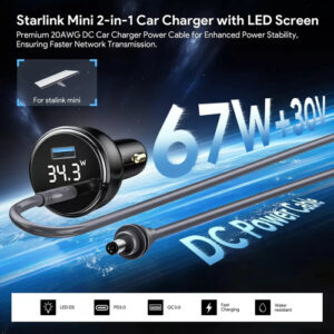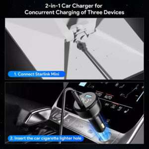 Carregamento versátil em qualquer lugar – Este carregador multifuncional de carro fornece uma solução de energia abrangente para seu veículo. Com uma porta USB-A, uma porta USB-C e um cabo de saída DC dedicado de 9,84 pés (3M), você pode carregar simultaneamente uma variedade de dispositivos, incluindo smartphones, tablets, dashcams e até mesmo seu Starlink Mini. Carregamento rápido e