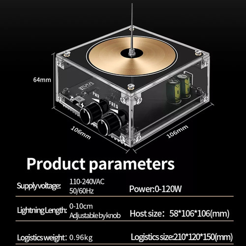 195 * 145 * 115 mm/7,68 * 5,71 * 4,53 polegadas Peso da embalagem: 659g/1,45 lb Lista de embalagem: 1 * Bobina Tesla