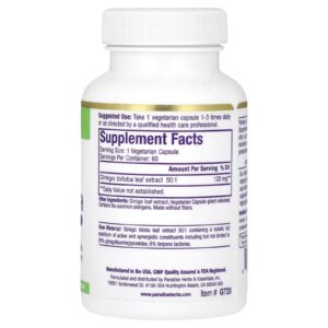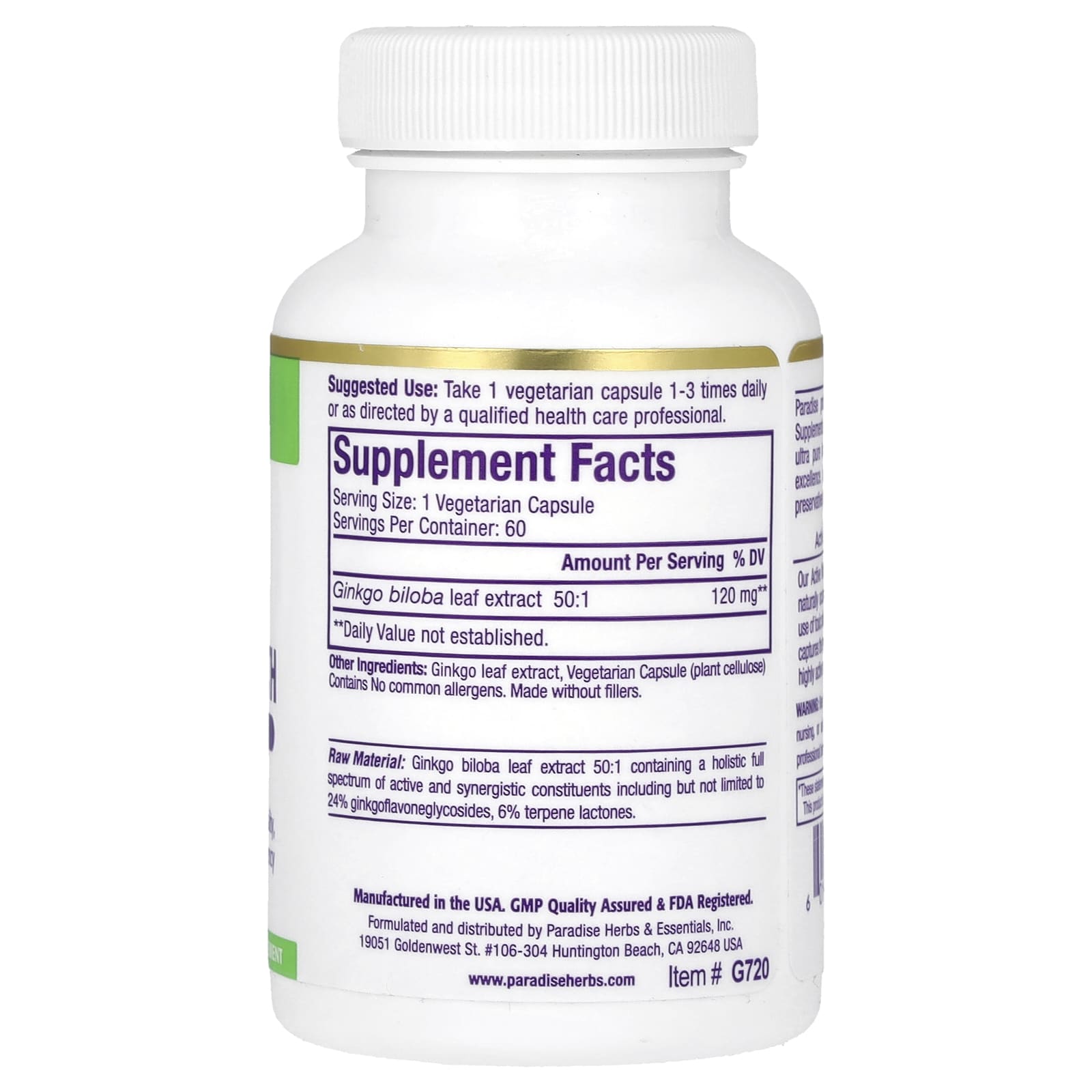 Paradise Herbs Ginkgo 120 mg 60 Cápsulas Vegetarianas – Paradise Herbs Suplementos Ervas Ginkgo Biloba.