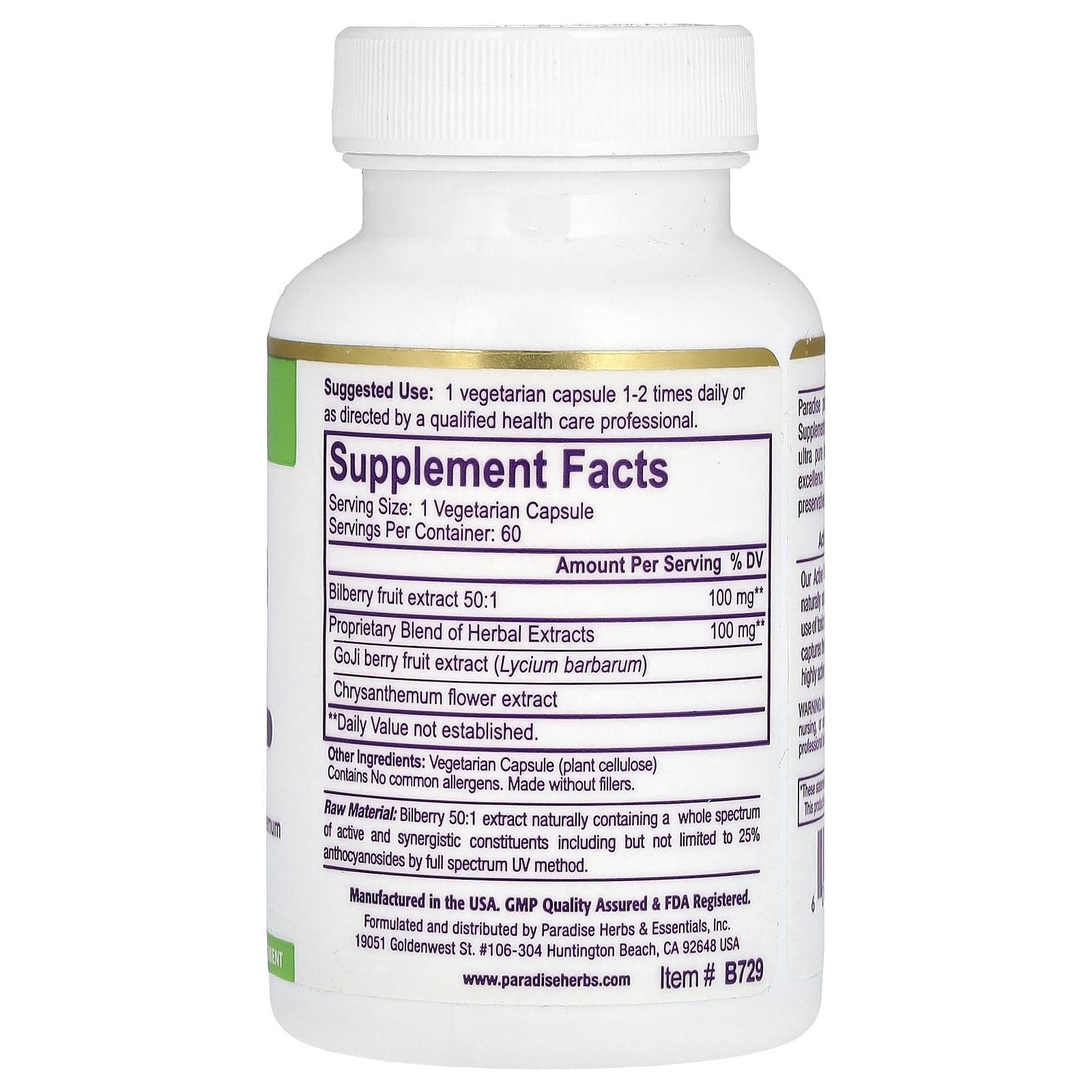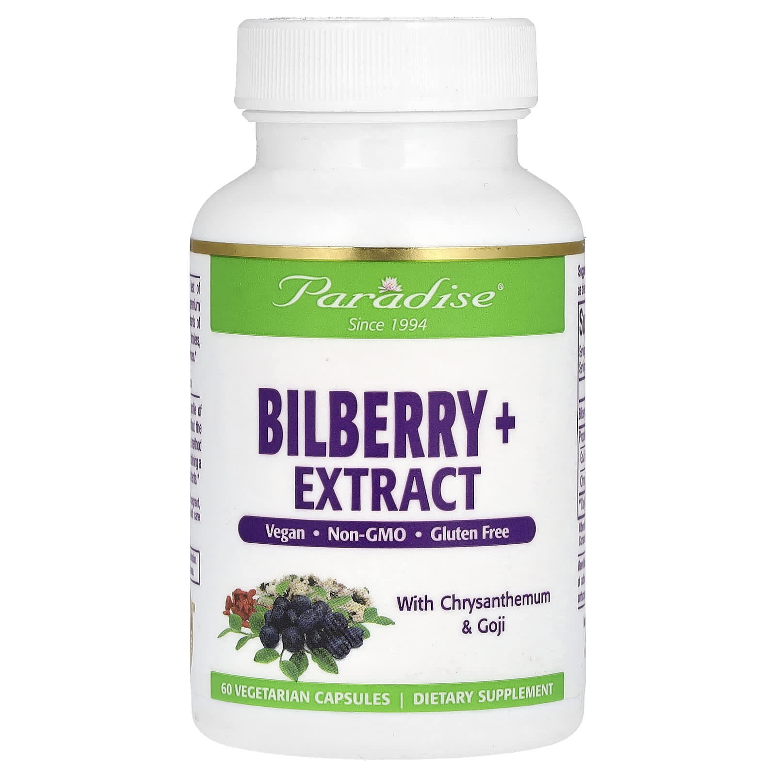 Paradise Herbs Mirtilo Europeu + Extrato com Crisântemo e Goji 60 Cápsulas Vegetarianas – Paradise Herbs Suplementos Ervas Mirtilo.